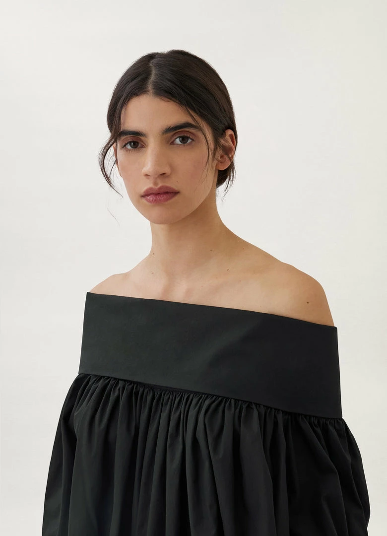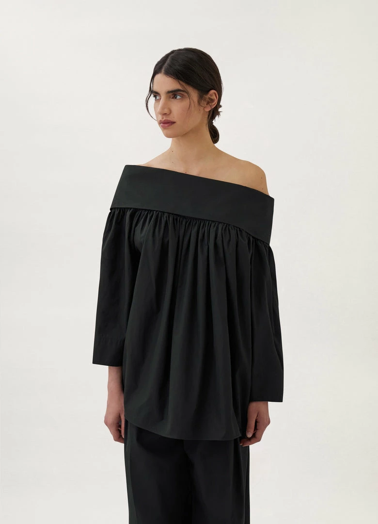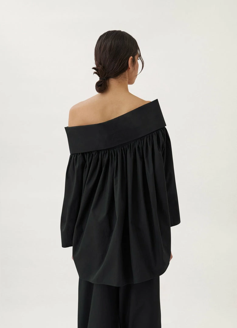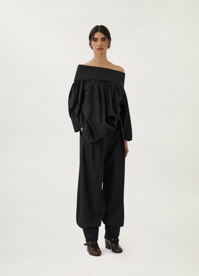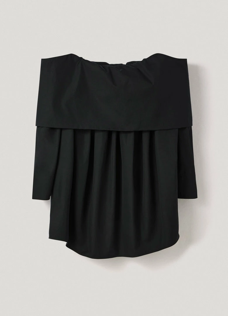 This blouse is made of a heavy poplin for a warmer wear, with a smooth surface woven from organic cotton yarn. Its billowy, pleated silhouette can be draped from the shoulders in various ways, with an interior elastic under the foldable collar. It features three-quarter sleeves and a rounded hem.