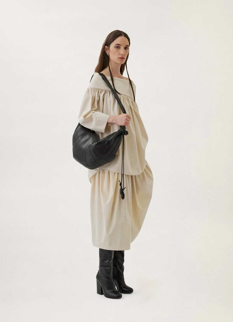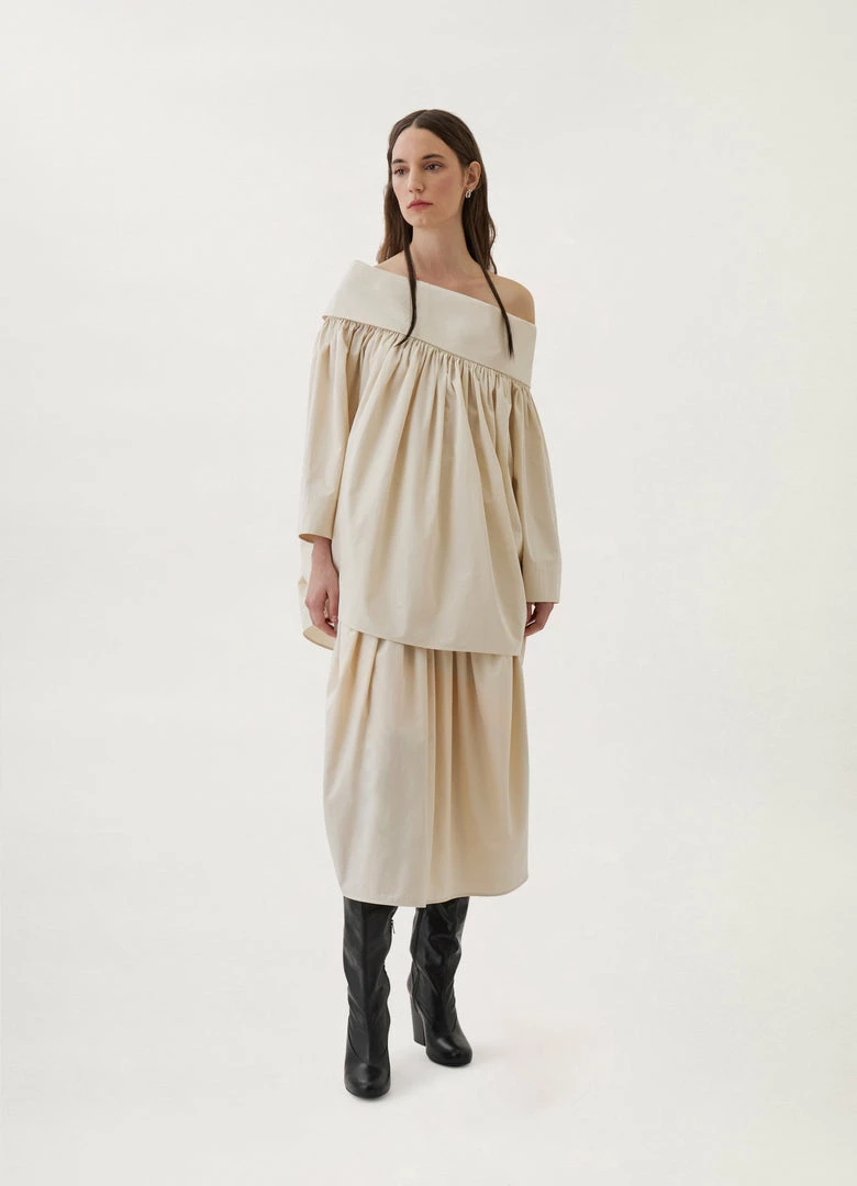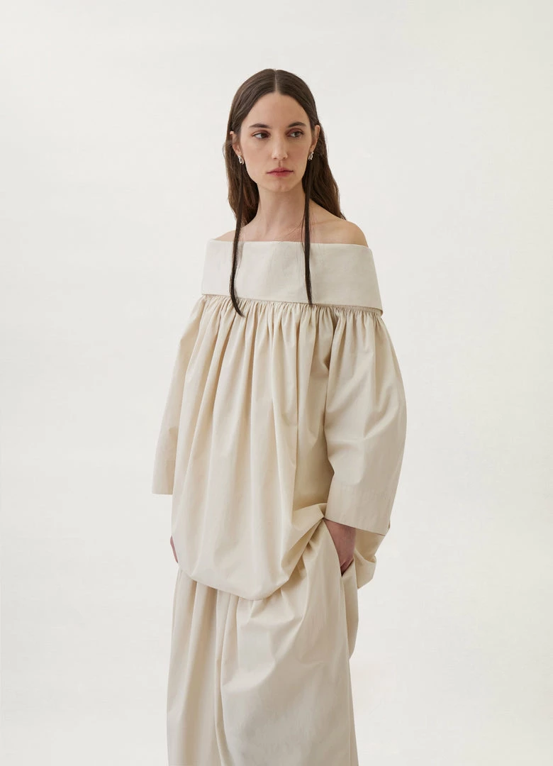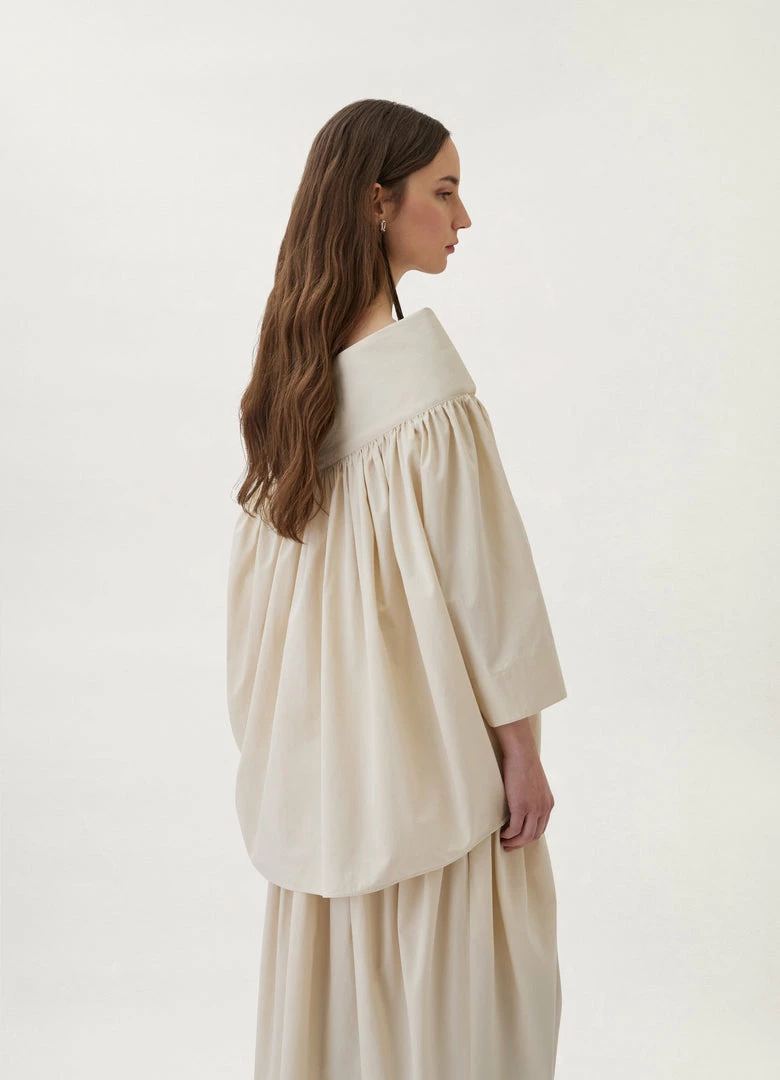 This blouse is made of a heavy poplin for a warmer wear, with a smooth surface woven from organic cotton yarn. Its billowy, pleated silhouette can be draped from the shoulders in various ways, with an interior elastic under the foldable collar. It features three-quarter sleeves and a rounded hem.