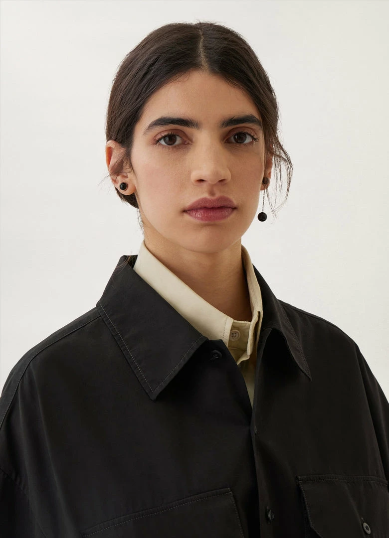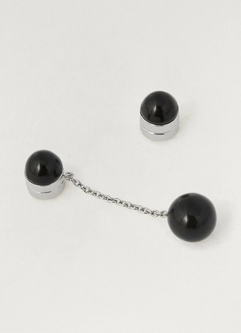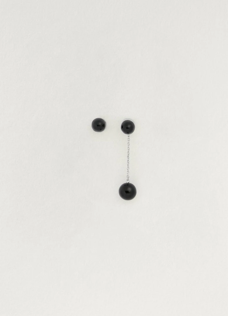 These earrings are made of black onyx or ivory agate cabochons, set on brass with a silver finish. These versatile pieces are inspired by beauty marks, the set comprising of two earrings with single and double hanging spots, held together by a delicate chain. They can be worn as asymmetric earrings or as broaches to be pinned along the neckline, like scattered music notes.