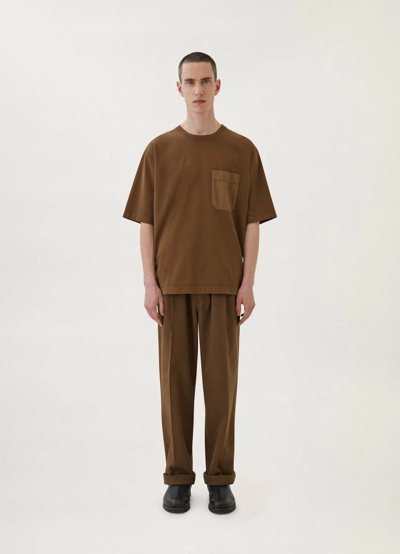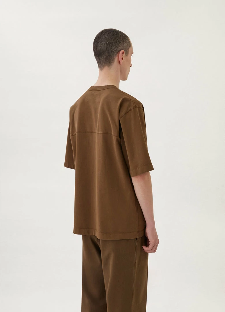 This garment-dyed t-shirt is made of cotton jersey with a soft, medium-weight hand. This classic Lemaire style has a relaxed fit, slightly dropped shoulders, a ribbed crewneck collar and boxy elbow-length sleeves. It is updated with a contrast fabric patch pocket and a back yoke seam. The open crew neck is finished with a ribbed binding detail.