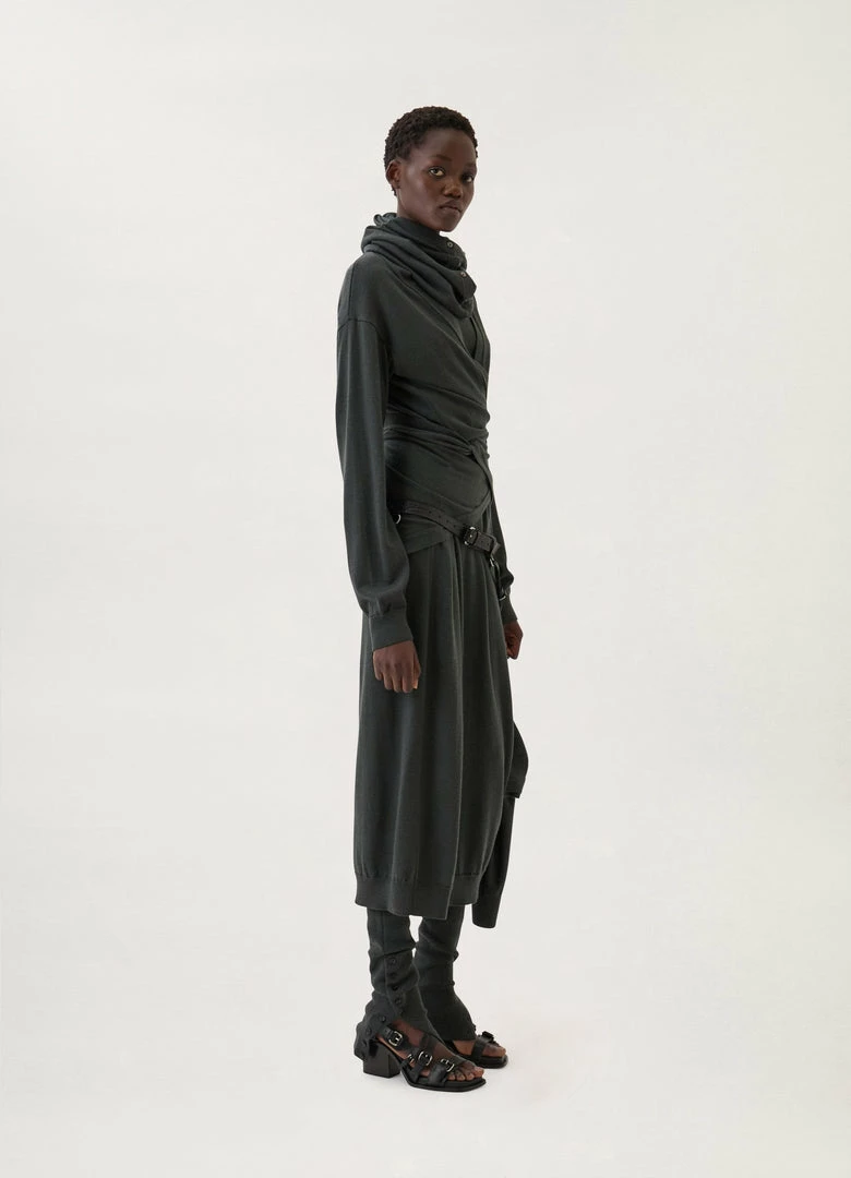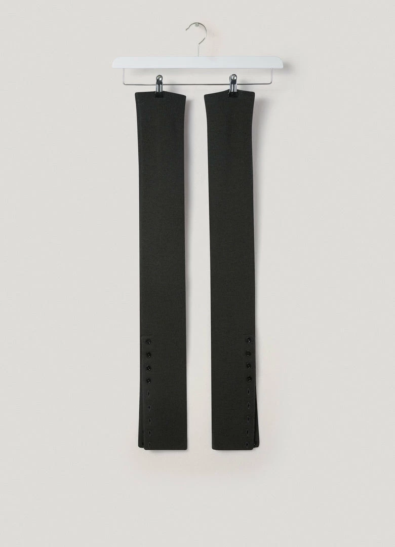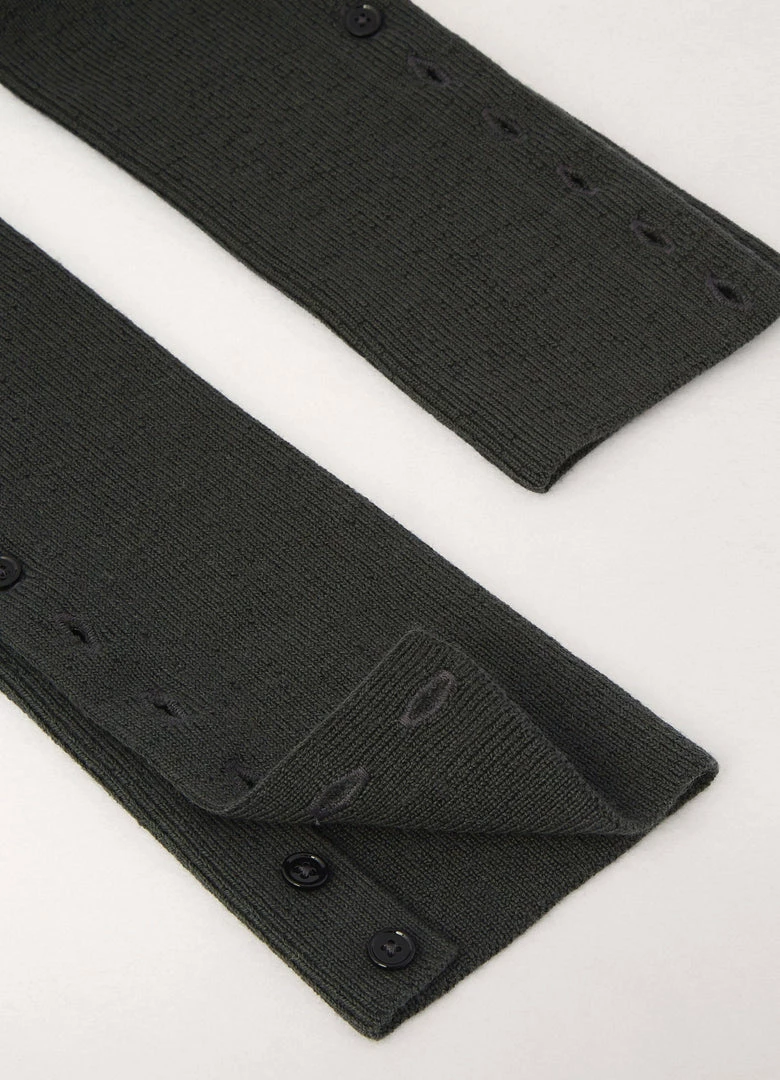 These gaiters are made of a merino blend with a dry hand knitted into a tight rib knit with a slightly heathered appearance. Practical and warm, they can be worn extended up the thigh or scrunched down below the knee to covering the foot, with buttoning to adjust the shape.