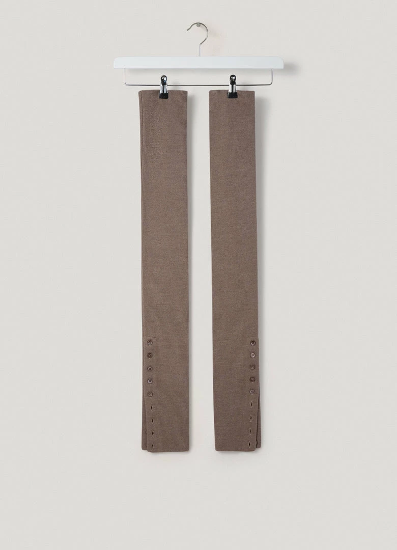 These gaiters are made of a merino blend with a dry hand knitted into a tight rib knit with a slightly heathered appearance. Practical and warm, they can be worn extended up the thigh or scrunched down below the knee to covering the foot, with buttoning to adjust the shape.
