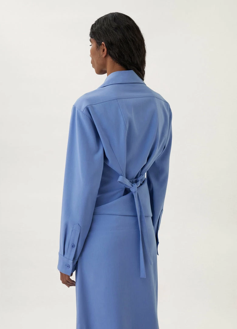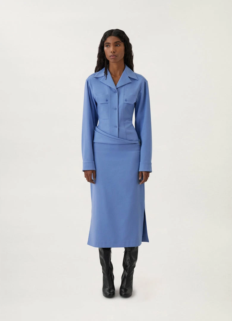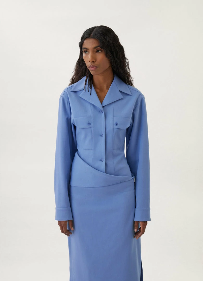 This shirt is made of a wooly cotton blend with a refined drape and a soft hand. It has a convertible collar and two faux pockets on the front that appear as though they have been cut in half. Its silhouette is fitted, and can be adjusted at the waist using the removable belt and two belt loops on the back.