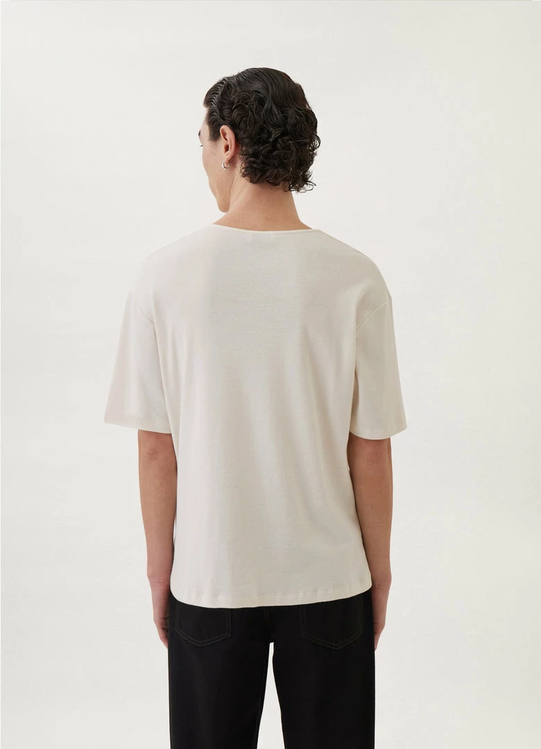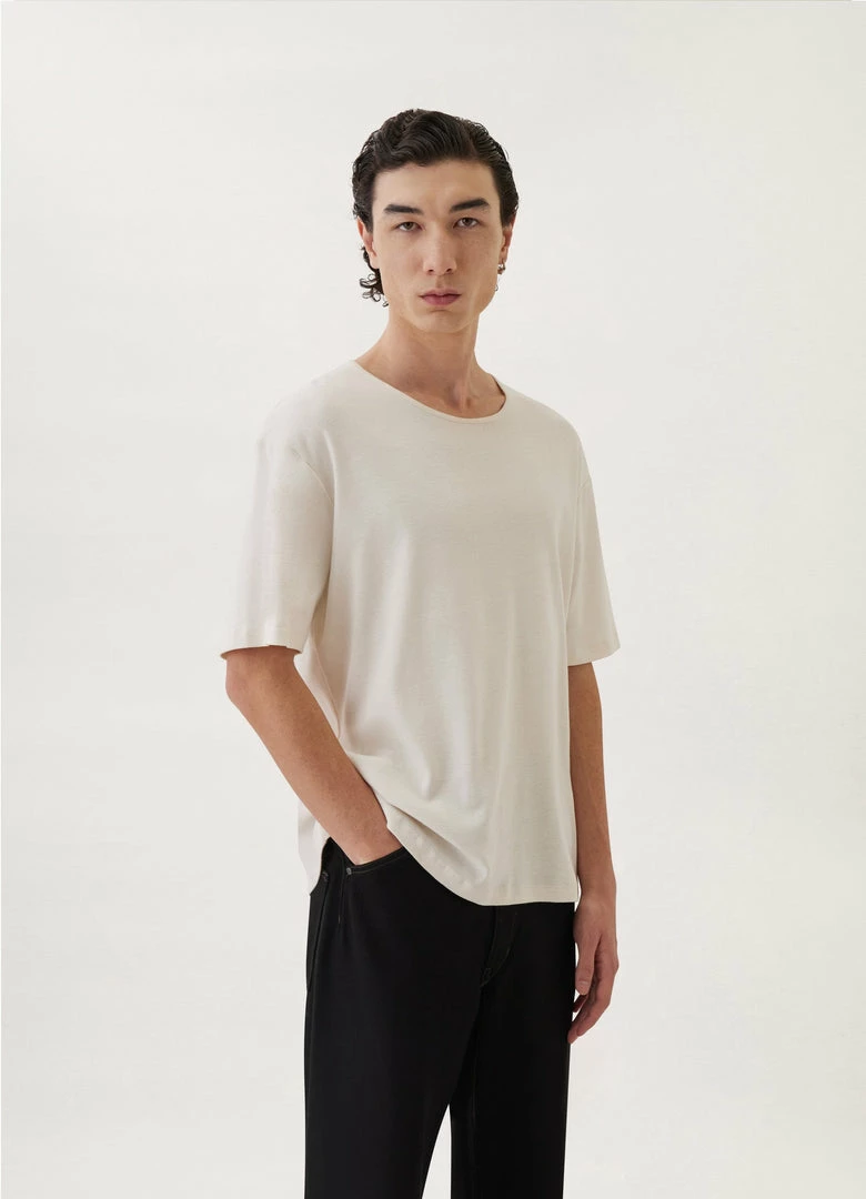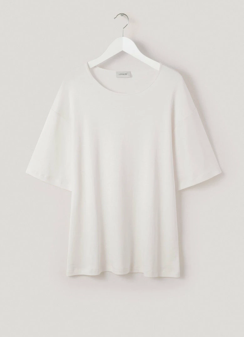 This t-shirt is made of a lightweight ribbed jersey with a dry hand. This classic Lemaire style has a relaxed fit, slightly dropped shoulders and short sleeves with minimal finishings. The open crew neck is finished with a ribbed binding detail.