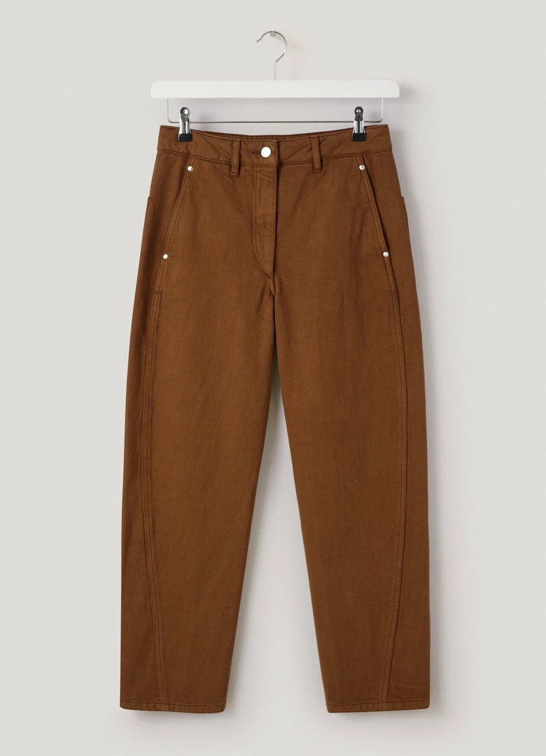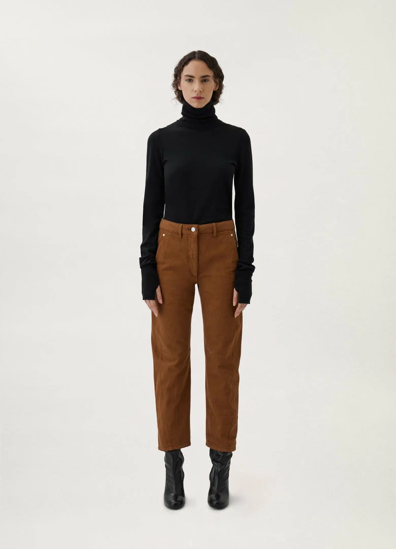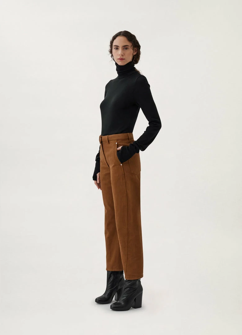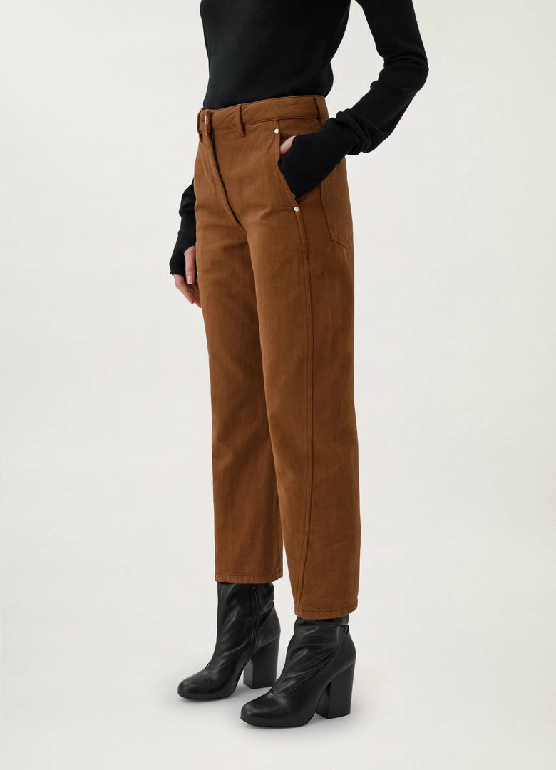 These pants are a Lemaire classic. They are made of a garment-dyed denim – a classic house fabric with a thick, round hand. Key features include pockets and twisted side seams giving a slightly curved volume to the leg. Their cut is straight and finished with workwear details.
