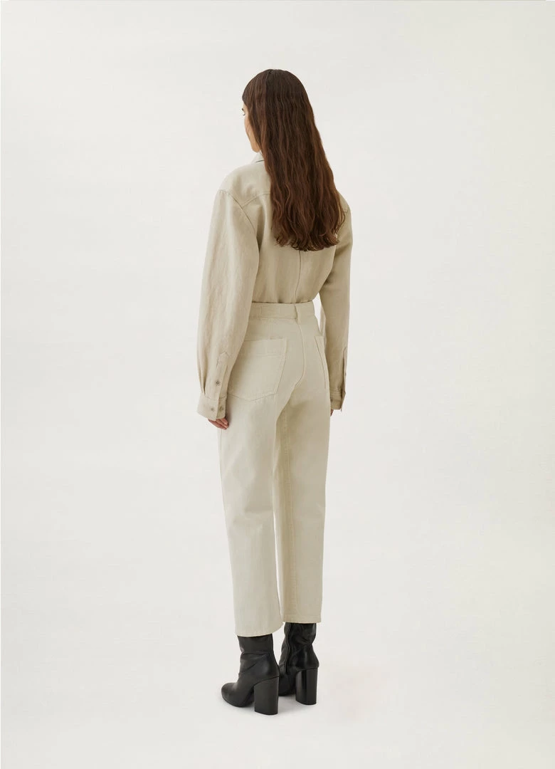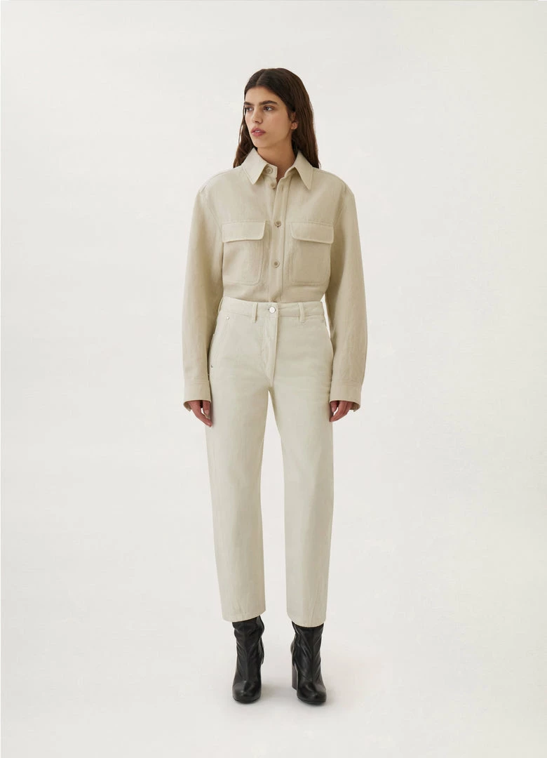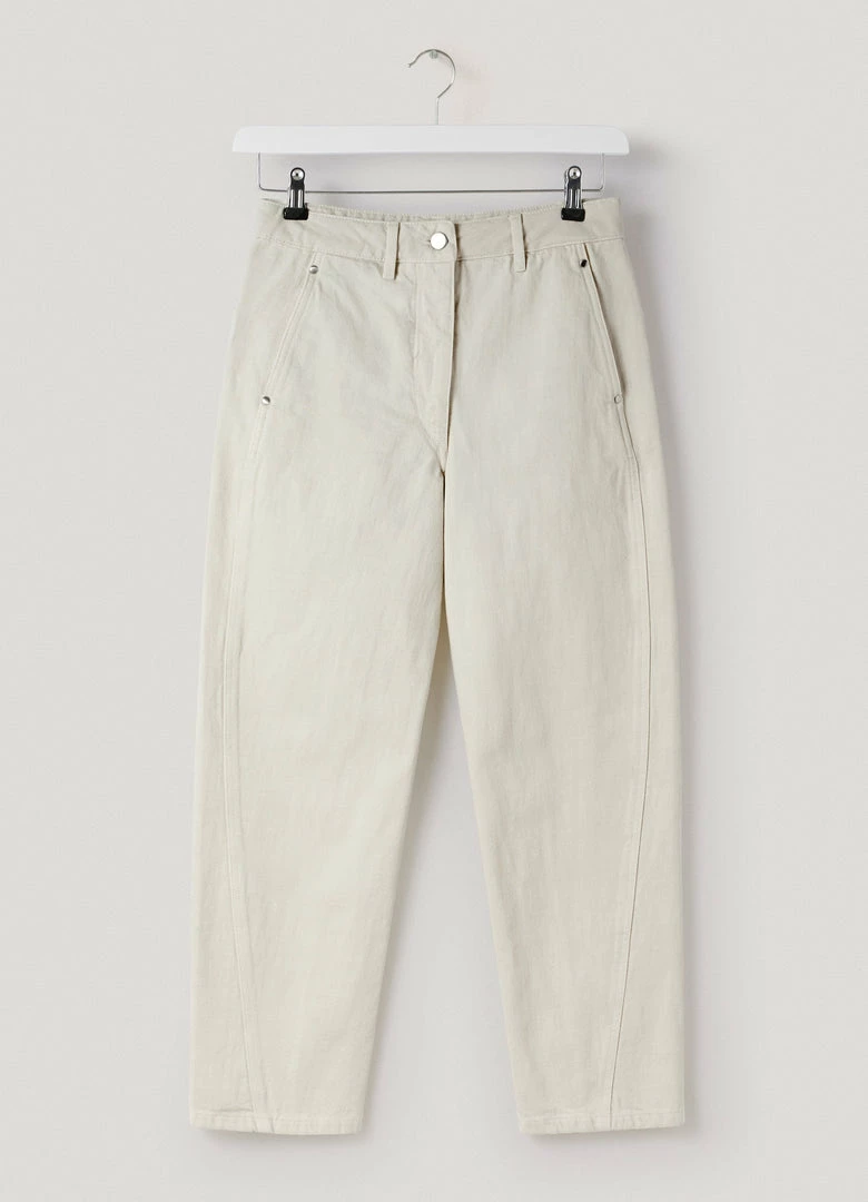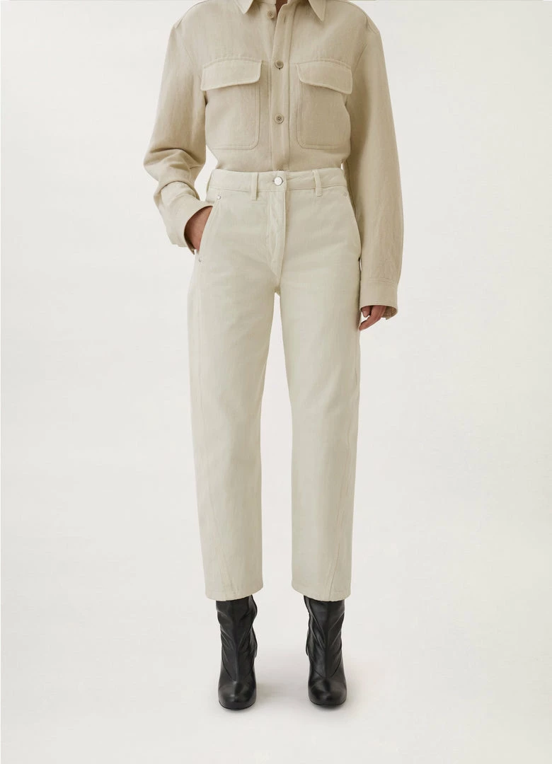 These pants are a Lemaire classic. They are made of a garment-dyed denim – a classic house fabric with a thick, round hand. Key features include pockets and twisted side seams giving a slightly curved volume to the leg. Their cut is straight and finished with workwear details.