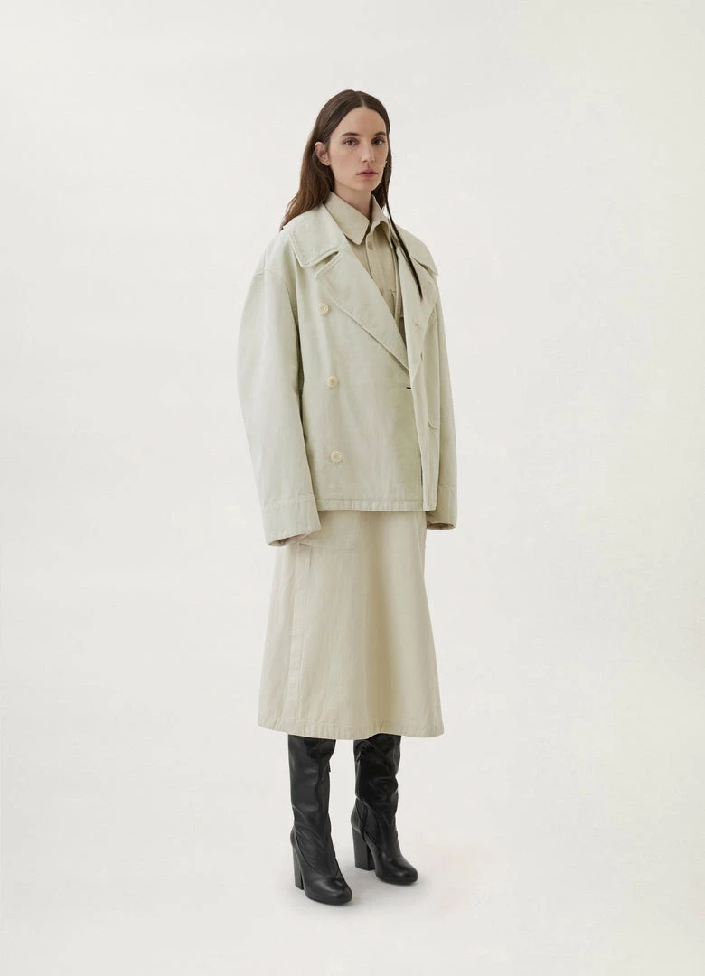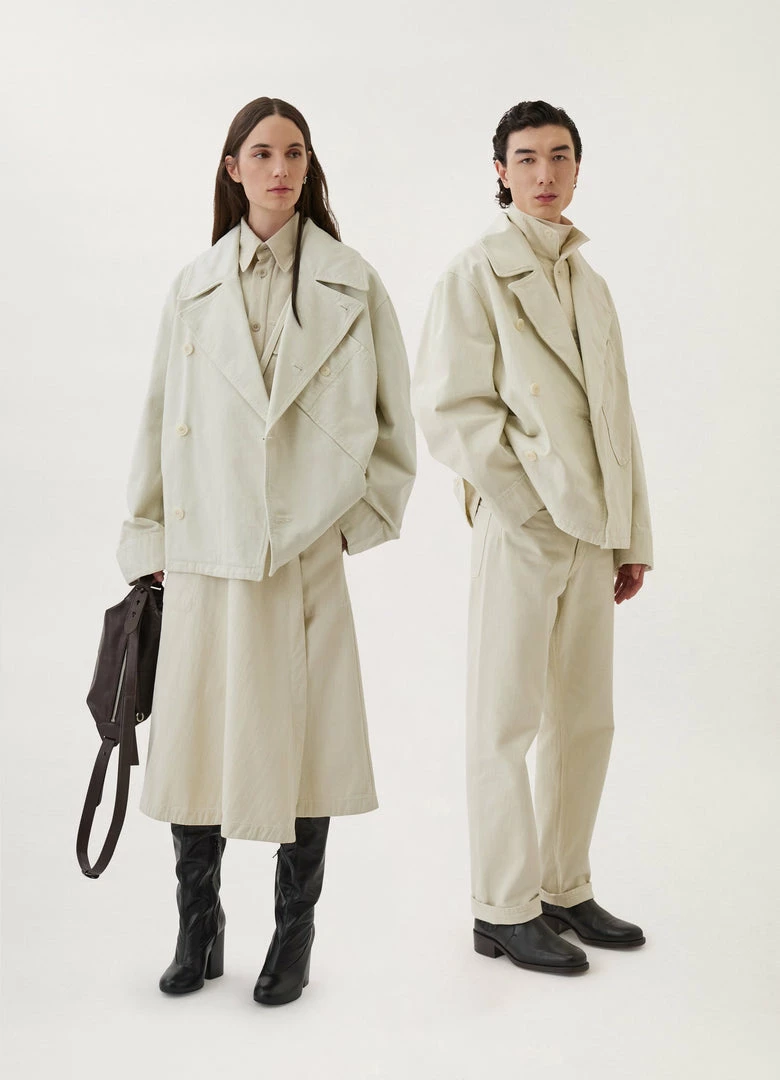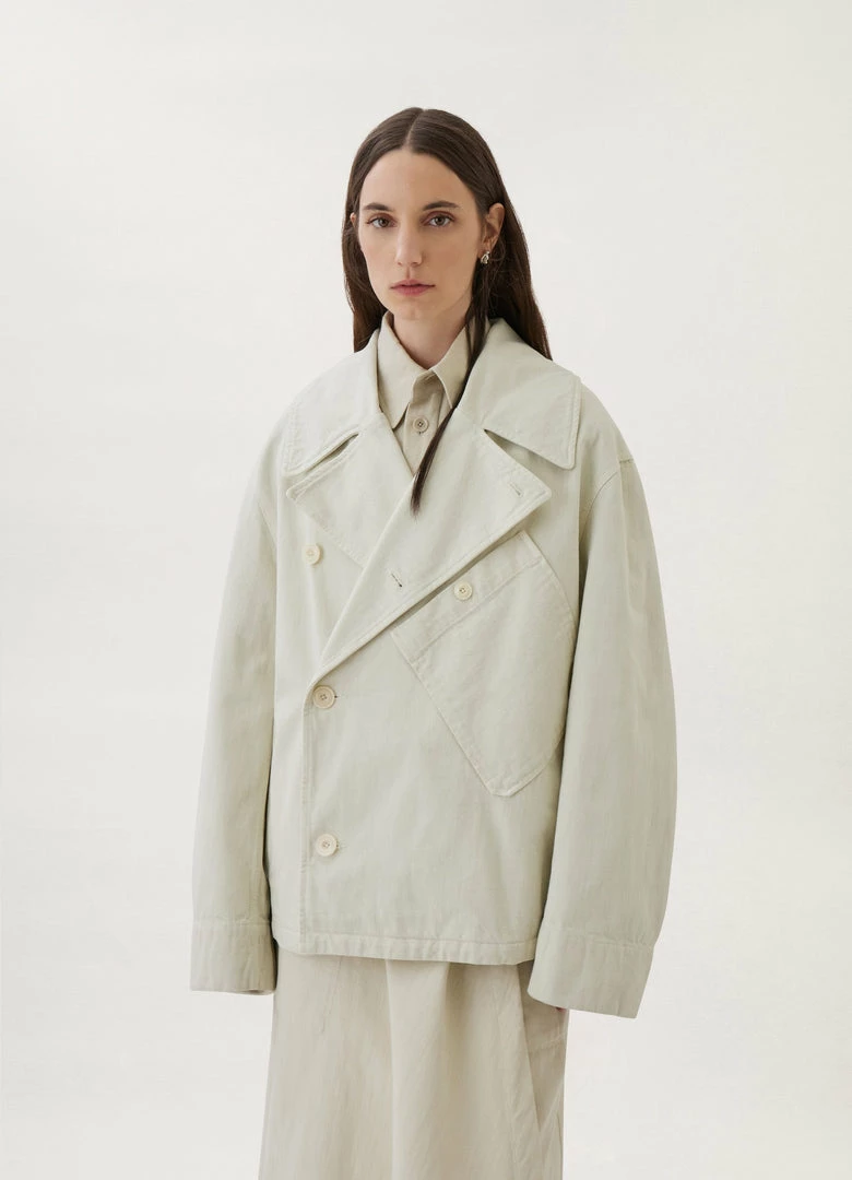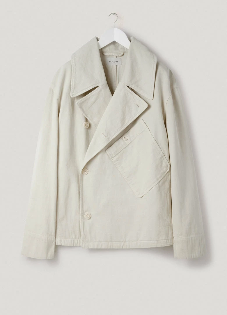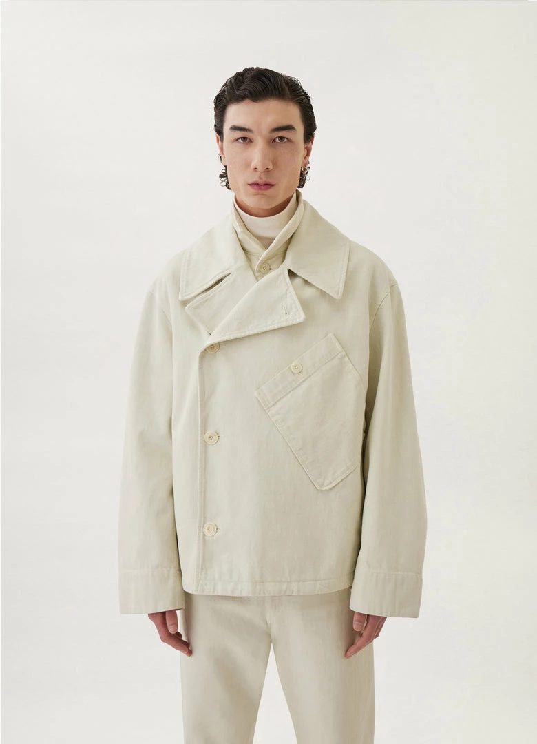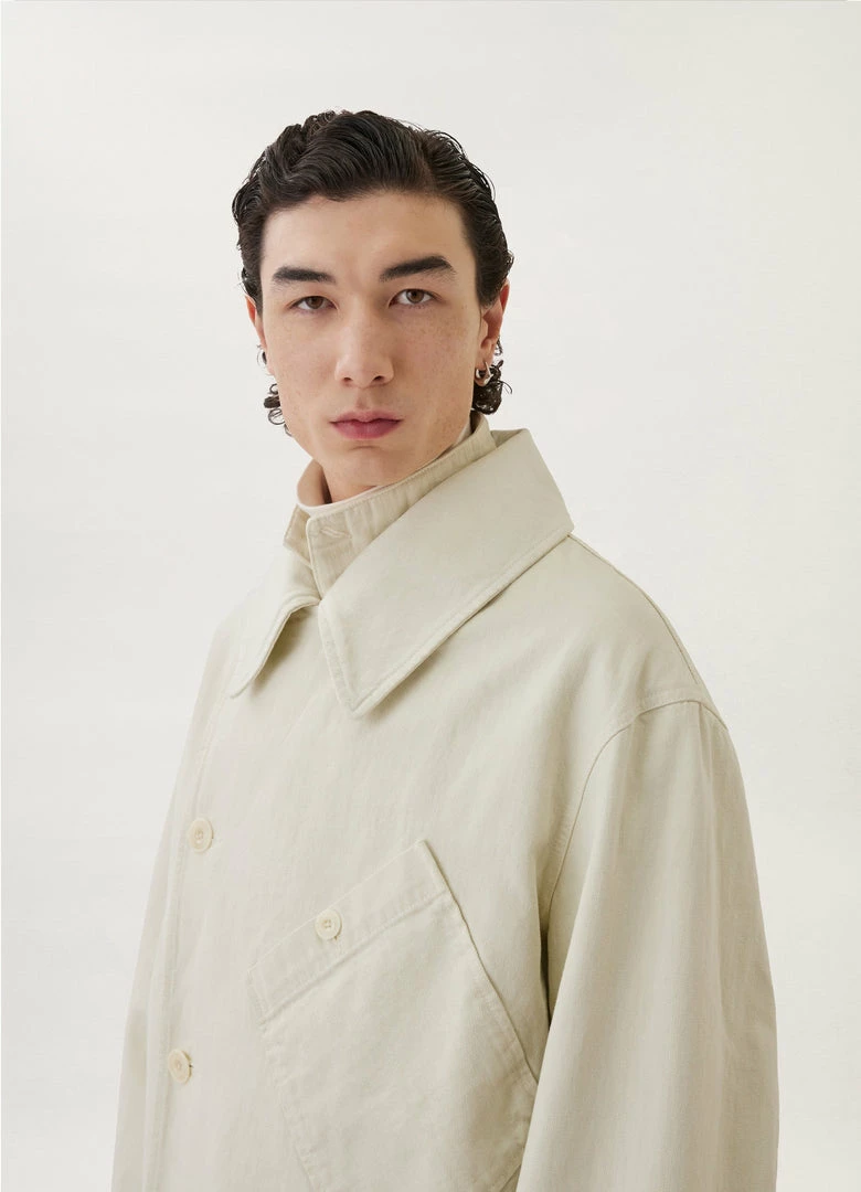 This unisex jacket is made of a garment-dyed denim – a classic Lemaire fabric with a thick, round hand. It has a straight, boxy fit that is topped with a large, convertible notched lapel. Its practical details are workwear inspired, and include a large buttoned patch pocket on the chest and adjustable fastening tabs on the back.