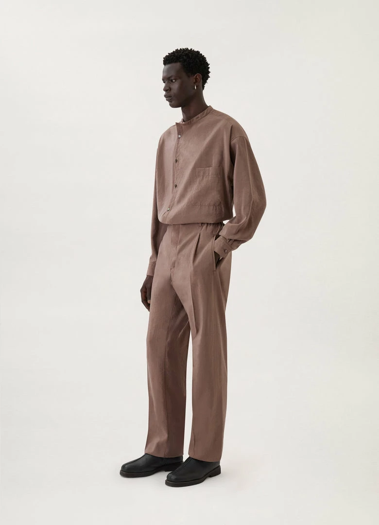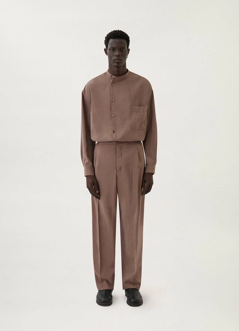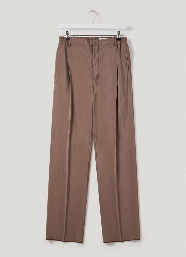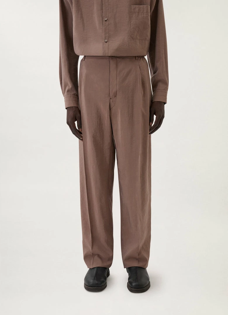 These pants are made of dry silk, a classic Lemaire fabric with a soft hand and tonic texture. The fit is relaxed and mid-rise, featuring a single pleat below the elasticated waistband and straight legs with no side seam. Other details include side welt pockets and a back welt pocket.
