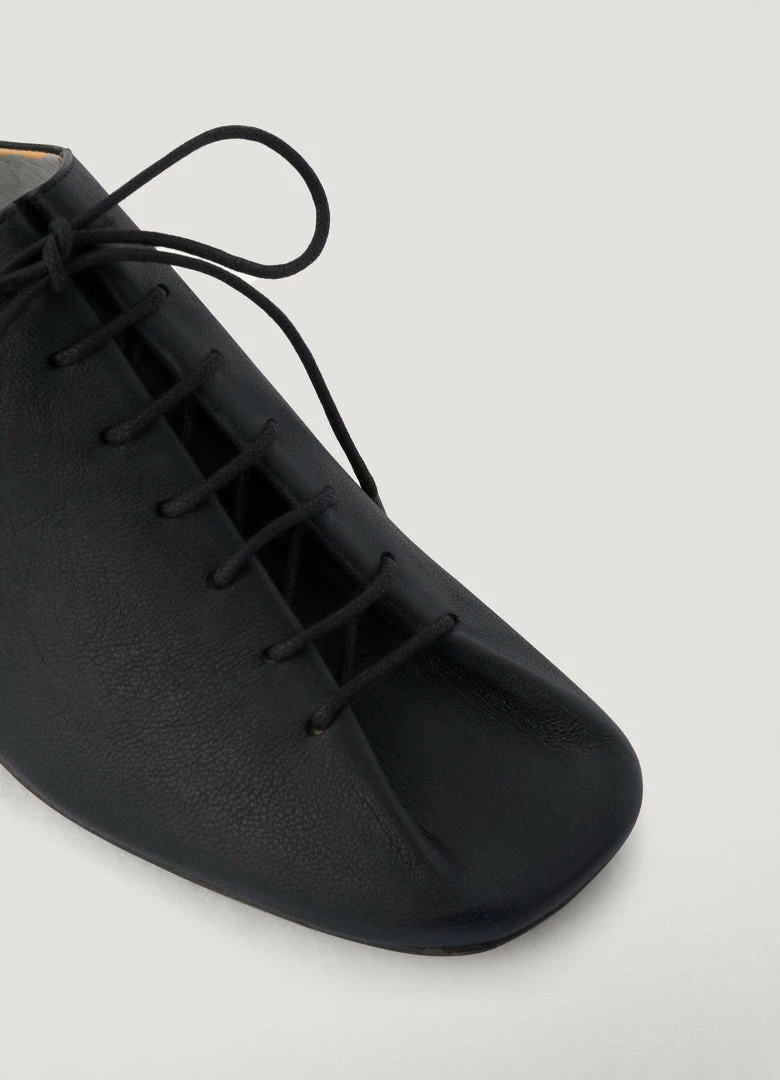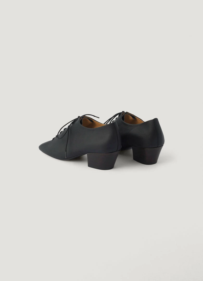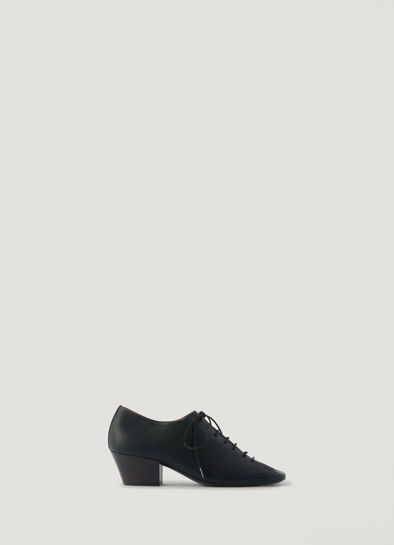 These heeled derbies are made of light lamb nappa leather with a soft, silky texture. Inspired by dance shoes, their details include waxed cotton laces, a slightly rounded square toe and Cuban heels. The upper and tongue of the shoes emerge from a single piece of leather folded over itself. They are fully lined in smooth leather.
