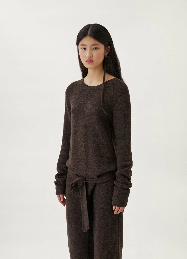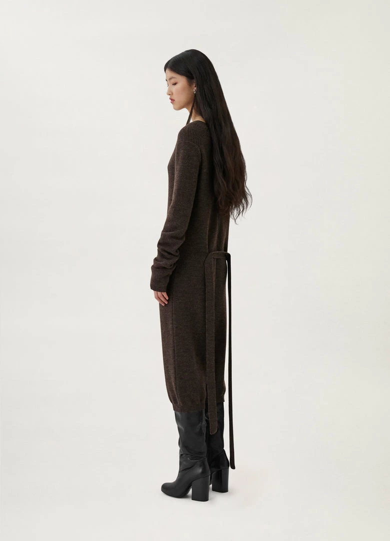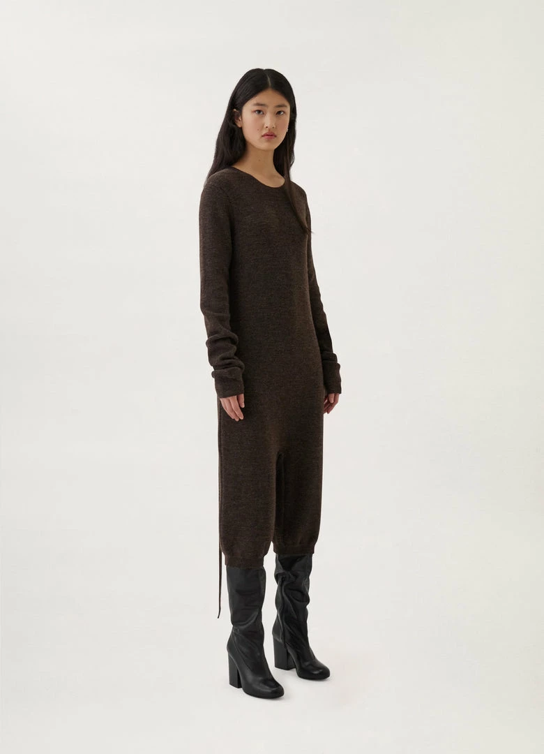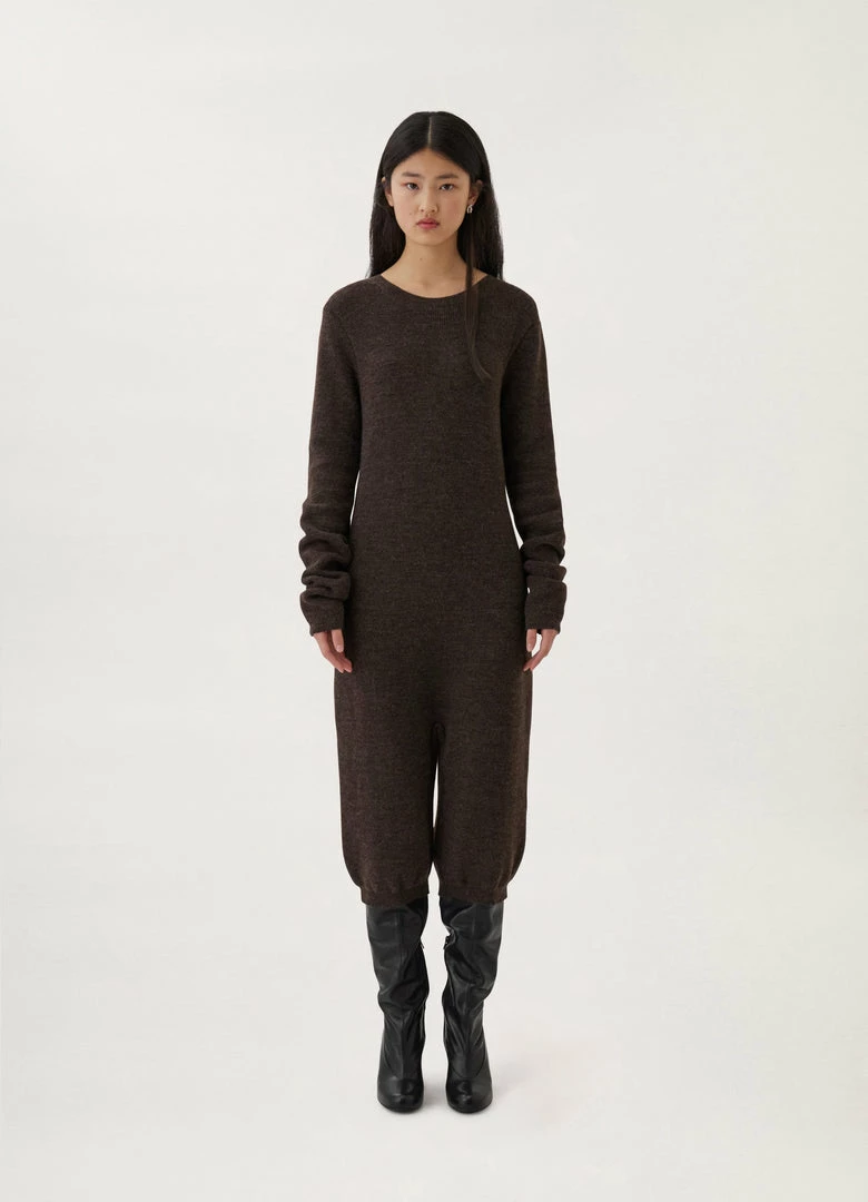 This jumpsuit is knitted in compact, medium-weight wool with a dry, military feel. It has a loose fit with slightly rounded legs that tighten at the hem. Practical details include a round, wide neckline and an adjustable matching belt that can be attached at the back of the waist with two buttons.