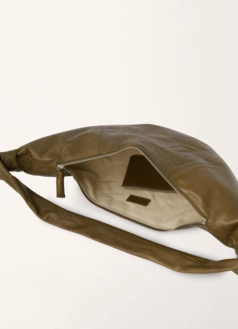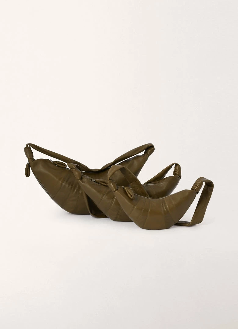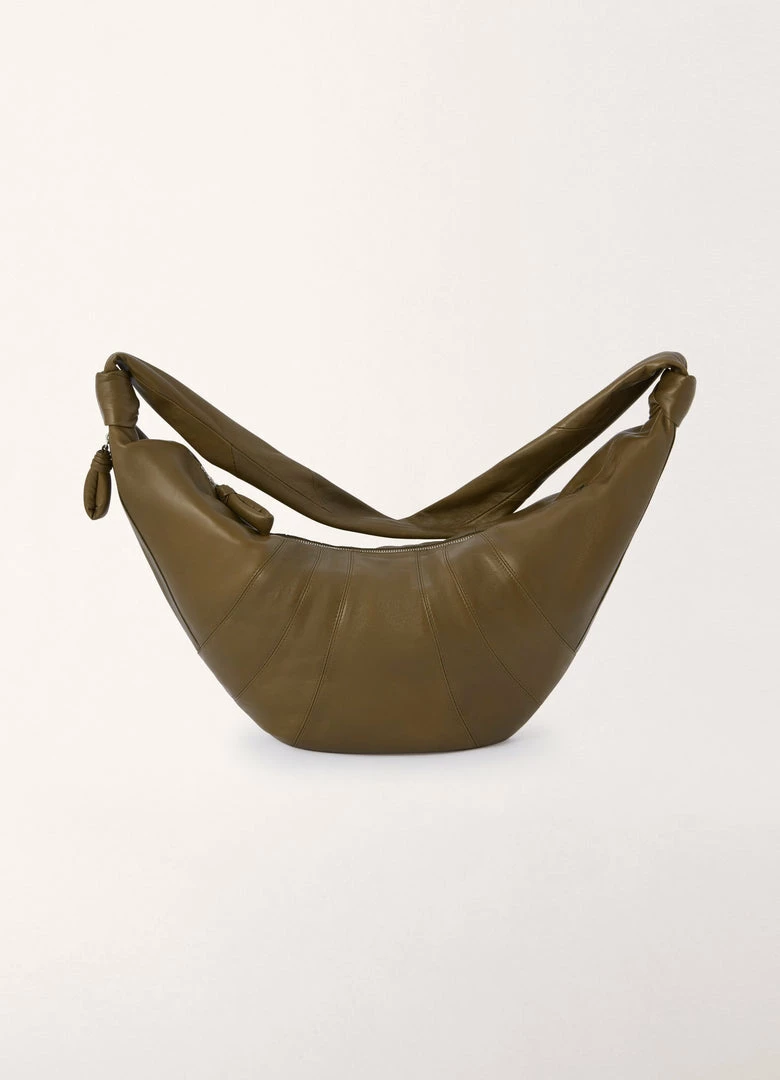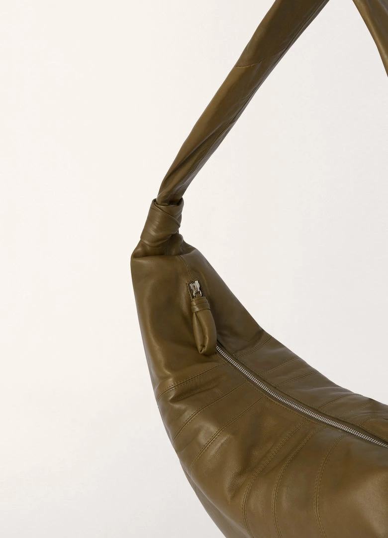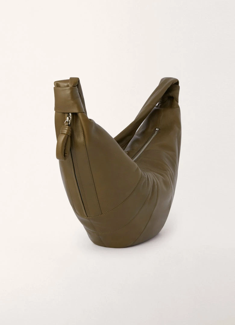 This classic LEMAIRE bag, the second largest of the Croissant bag family, is made of coated linen canvas with a crisp texture and a shiny finish.Inspired by the shape of a croissant pastry, the bag’s design is achieved through an assembly of topstitched cutouts. Its ergonomic shape wraps around the body for an easy, casual wear. It features a metal zipper, side knot finishings, a side zipped pocket and a removable A5 pouch. It can be worn as a shoulder or crossbody bag. Its material softens over time, allowing each bag to mold to its wearer.