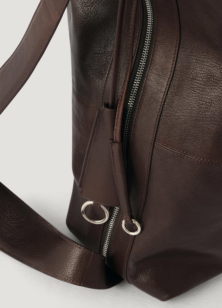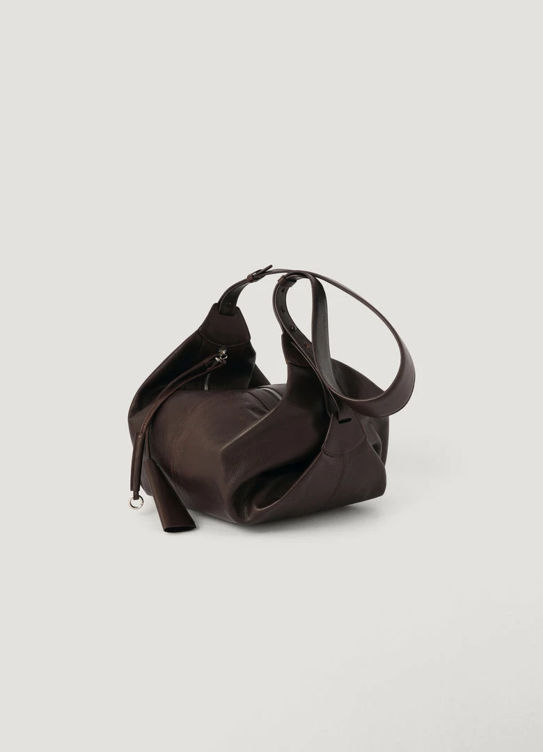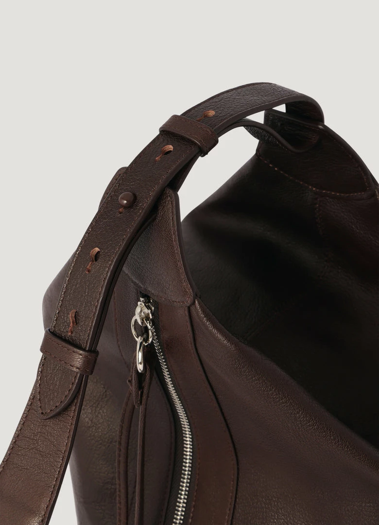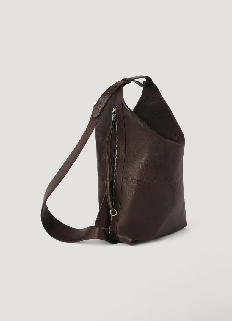This large unisex bag is made of a vegetable-tanned goat leather that is compact with a pronounced grain. Its hybrid shape is inspired by bucket bags and folds over itself like a fortune cookie. Details include a zipped closure with long leather pullers finished with metal key-rings, one of which is concealed under a bell-shaped leather holder. Its adjustable strap allows it to be worn on the shoulder or as a crossbody bag.