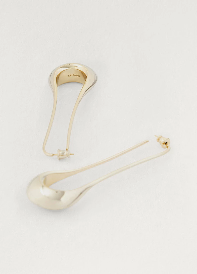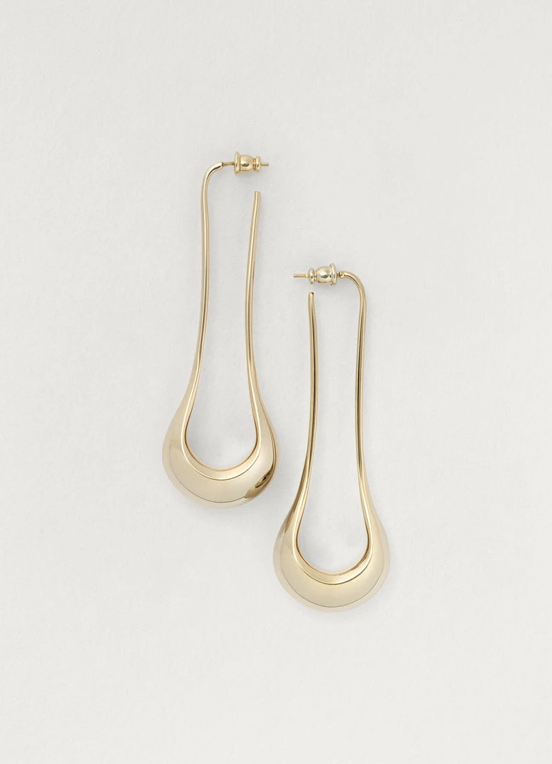 These earrings are made of bronze with a gold or silver finish and are shaped like two elongated falling drops with slightly angular edges.