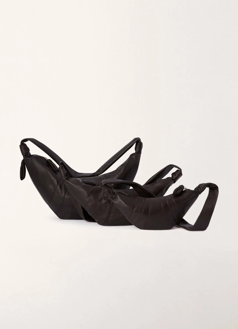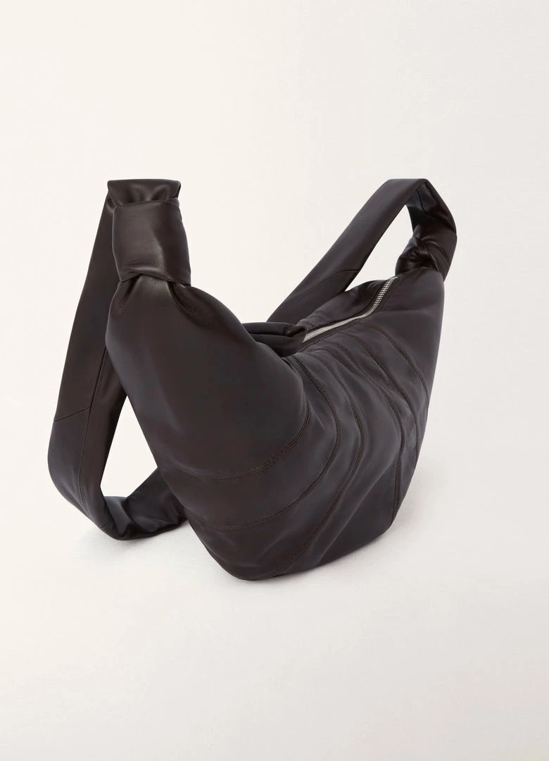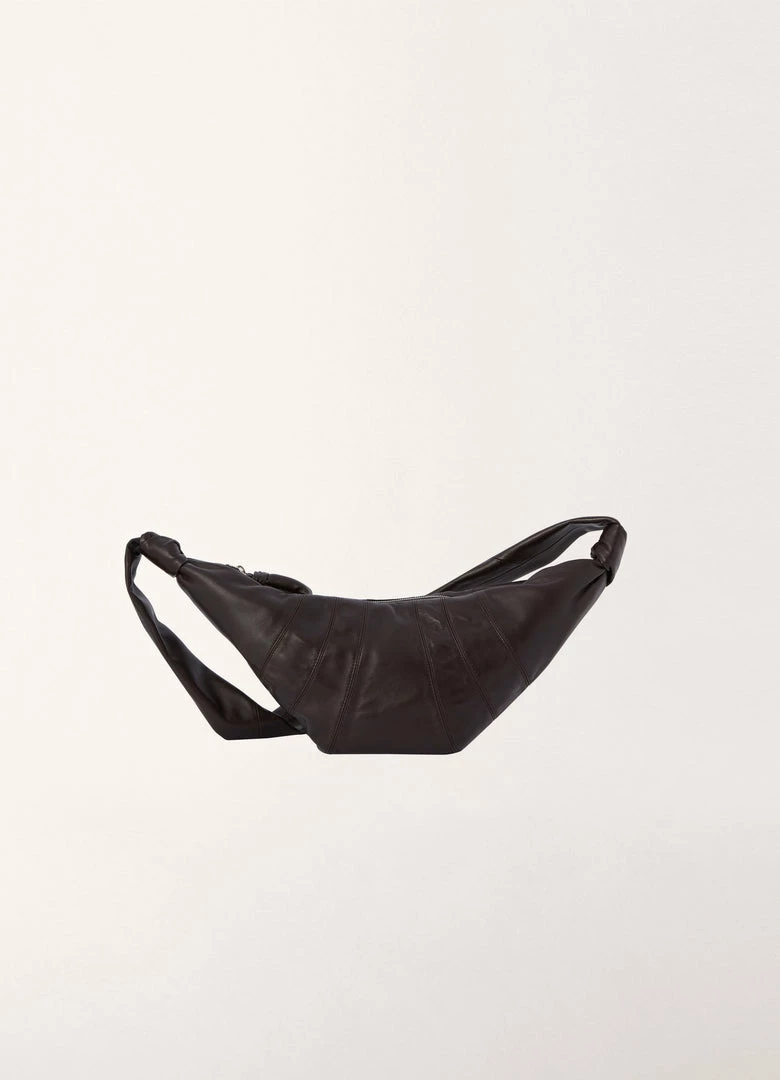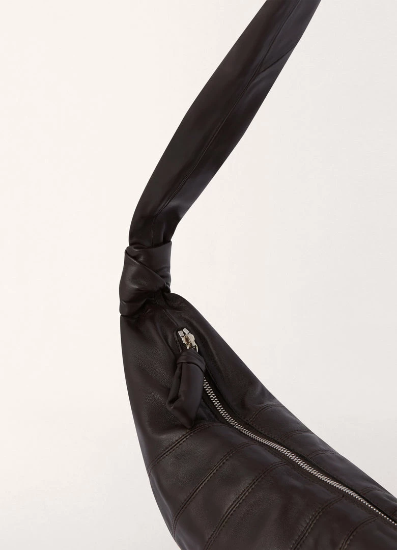 This classic Lemaire bag, the second largest of the Croissant bag family, is made of smooth nappa leather with a soft touch. Topstitched cutouts follow the ergonomic lines of this newly vegan bag. It features a metal zipper, side knot finishings. It can be worn as a shoulder or crossbody bag.