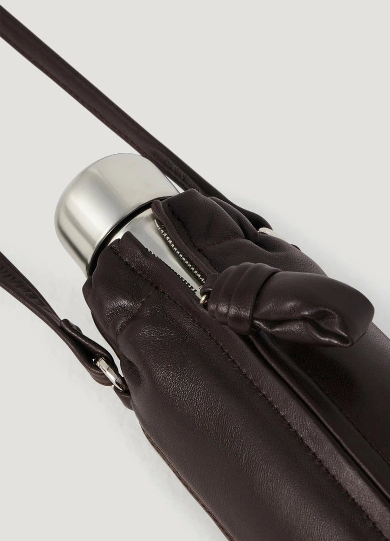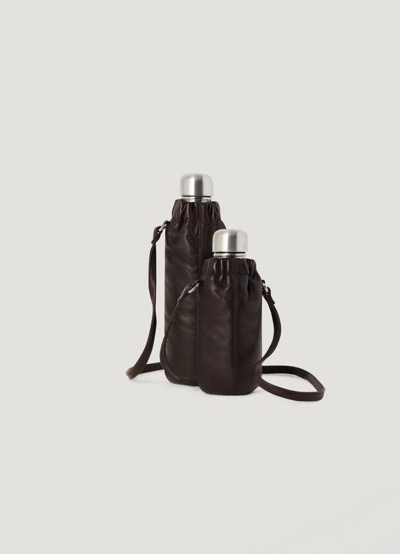 Inspired by the Croissant family, this unisex water bottle holder is made of smooth nappa leather with a soft touch, lined in water-repellent nylon. Topstitched cutouts follow its ergonomic lines, an elasticated and zipped opening allowing a 500 ml bottle to be easily fitted within. It features a metal zipper and a knotted puller. A leather cord allows the piece to be worn around the neck or as a crossbody.