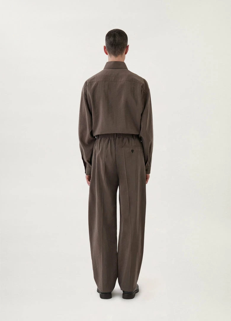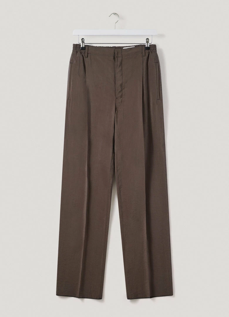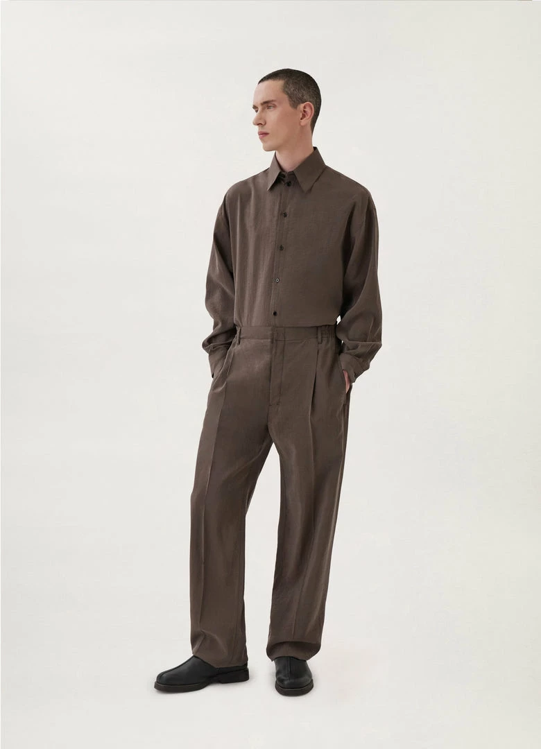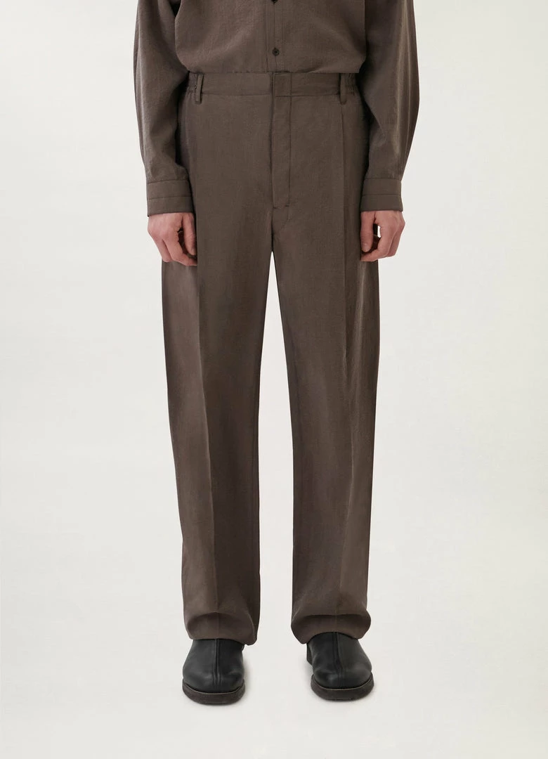 These pants are made of dry silk, a classic Lemaire fabric with a soft hand and tonic texture. The fit is relaxed and mid-rise, featuring a single pleat below the elasticated waistband and straight legs with no side seam. Other details include side welt pockets and a back welt pocket.