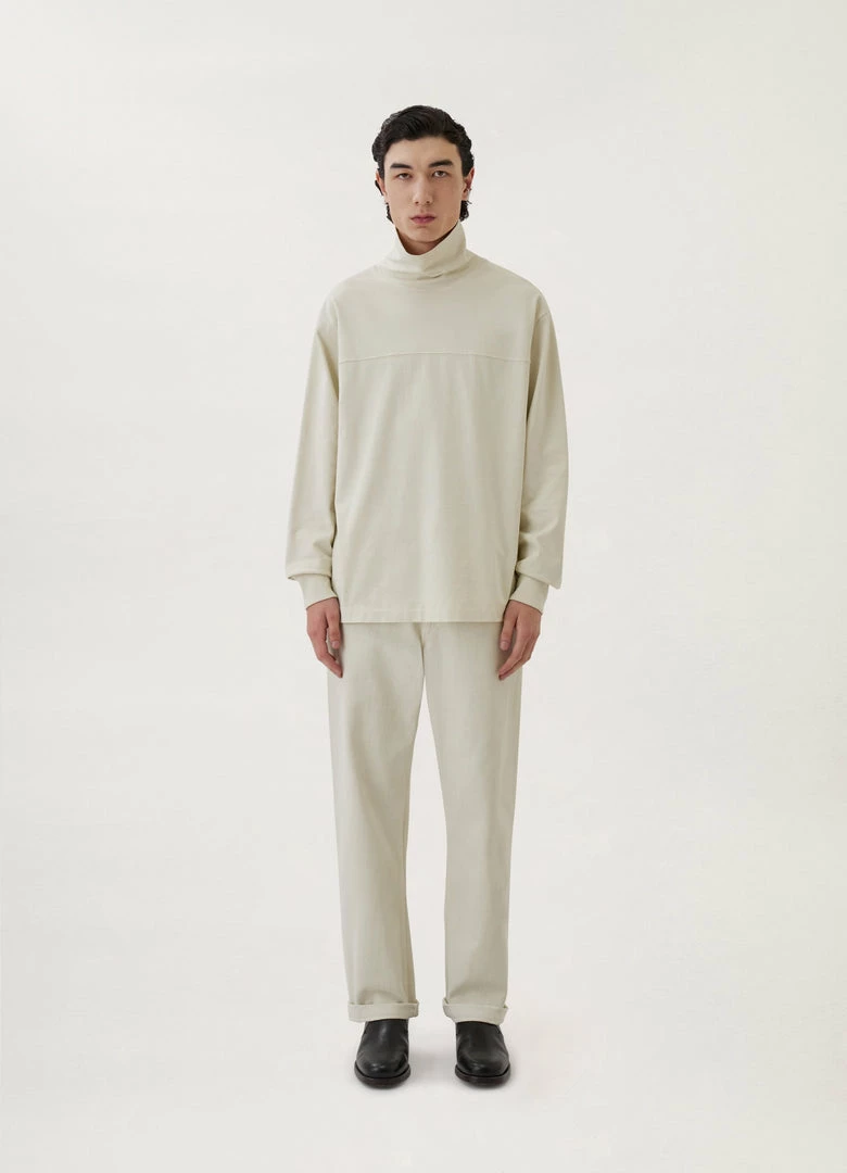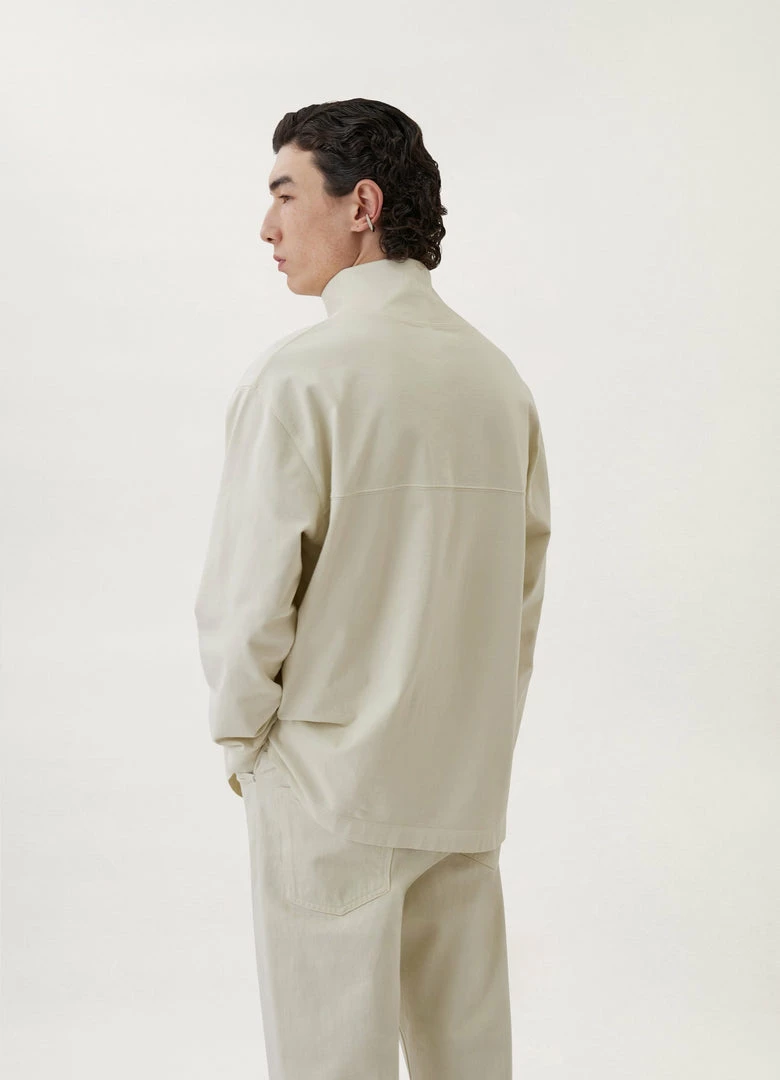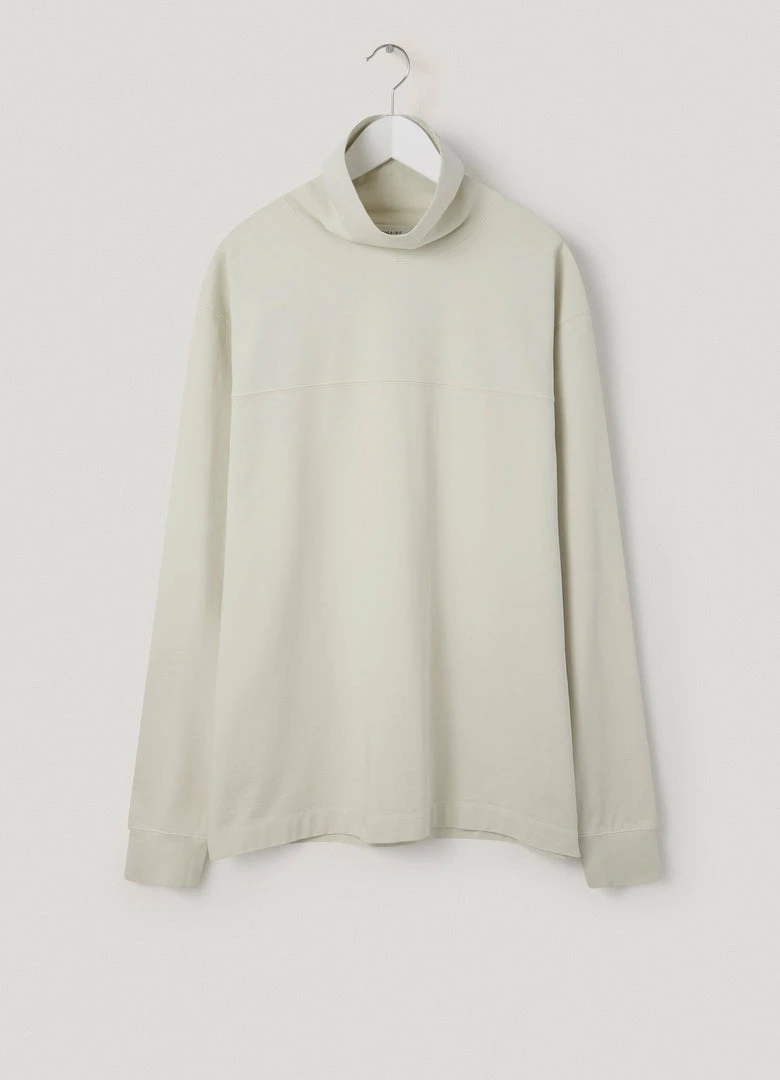 This garment-dyed sweatshirt is made of cotton jersey with a soft, medium-weight hand. The fit is relaxed with a high collar that hovers around the neck and ribbed cuffs that are fitted on the wrists. Tramline stitching details the shoulders, front and back yoke seams.