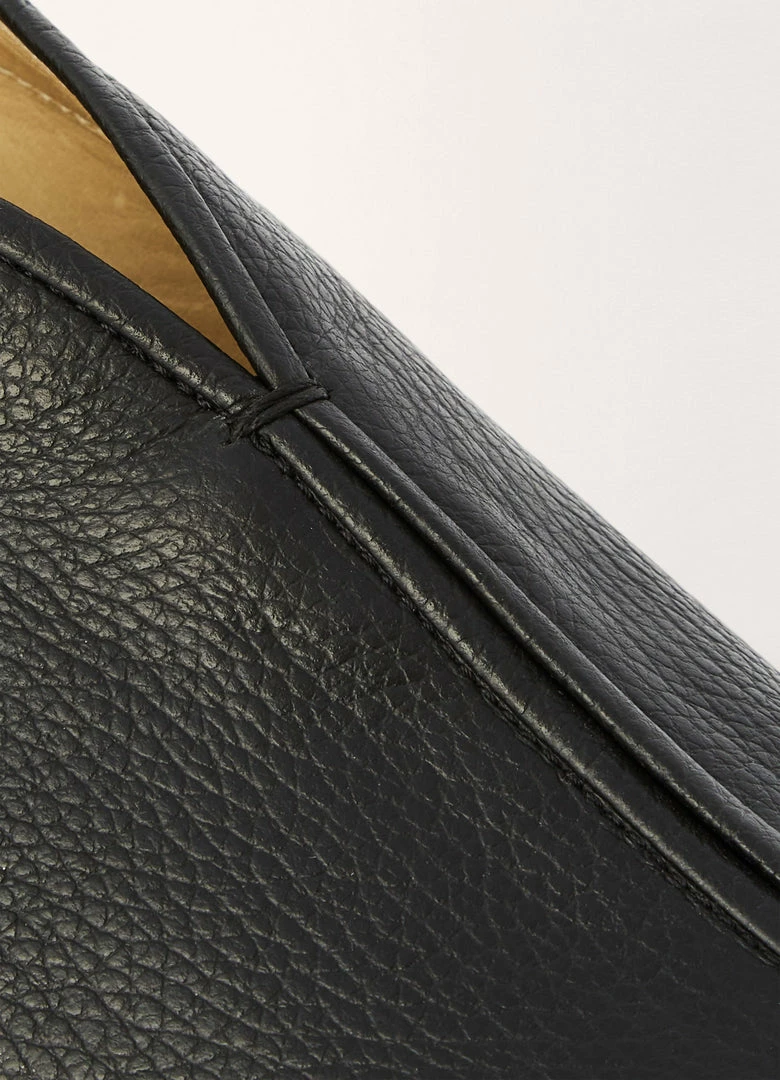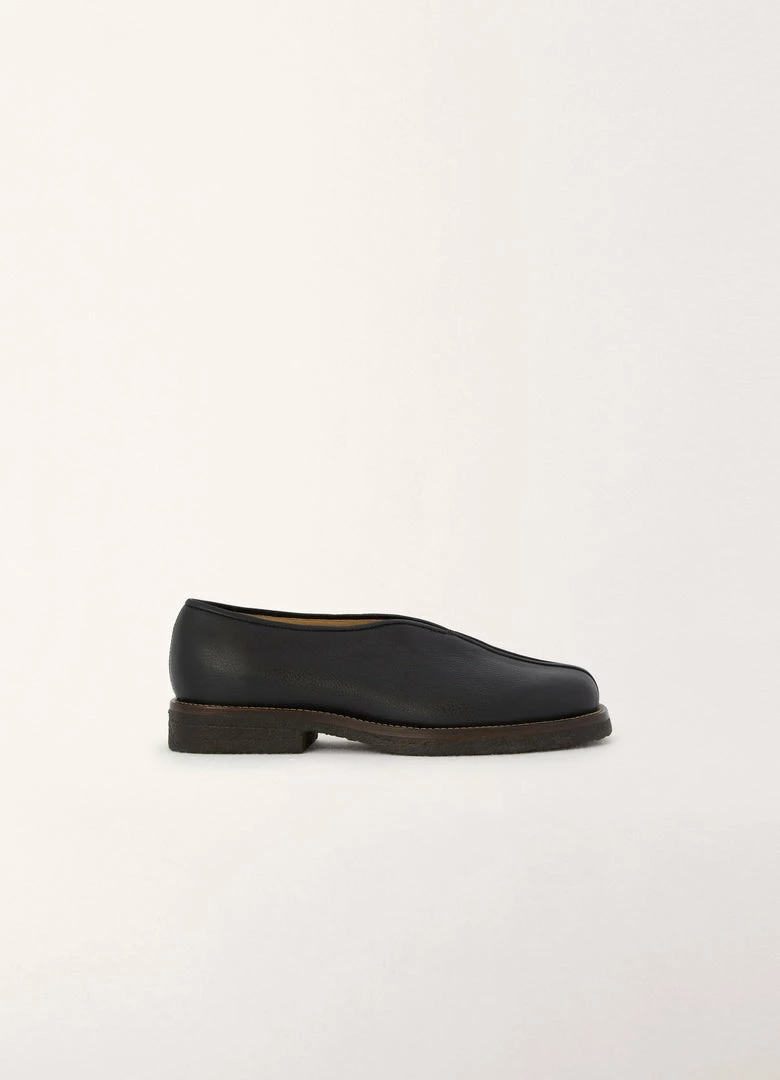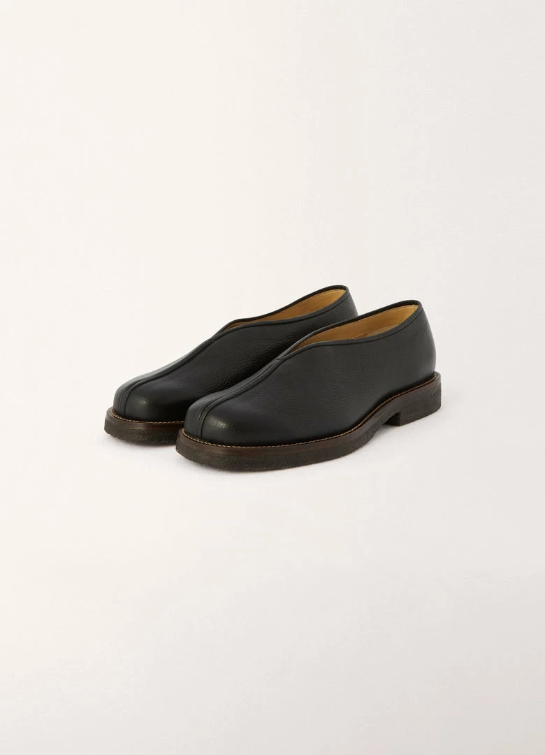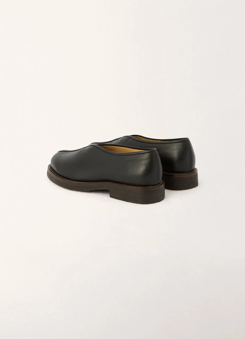 These slippers are made of deep grained leather with a soft shine. This classic Lemaire shape has a simple construction composed of two pieces of leather that are sewn together on the front and sealed with leather piping. A square toe and crepe sole add to their flexibility. They feature stitching and piping details.