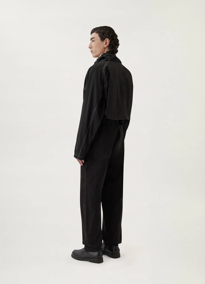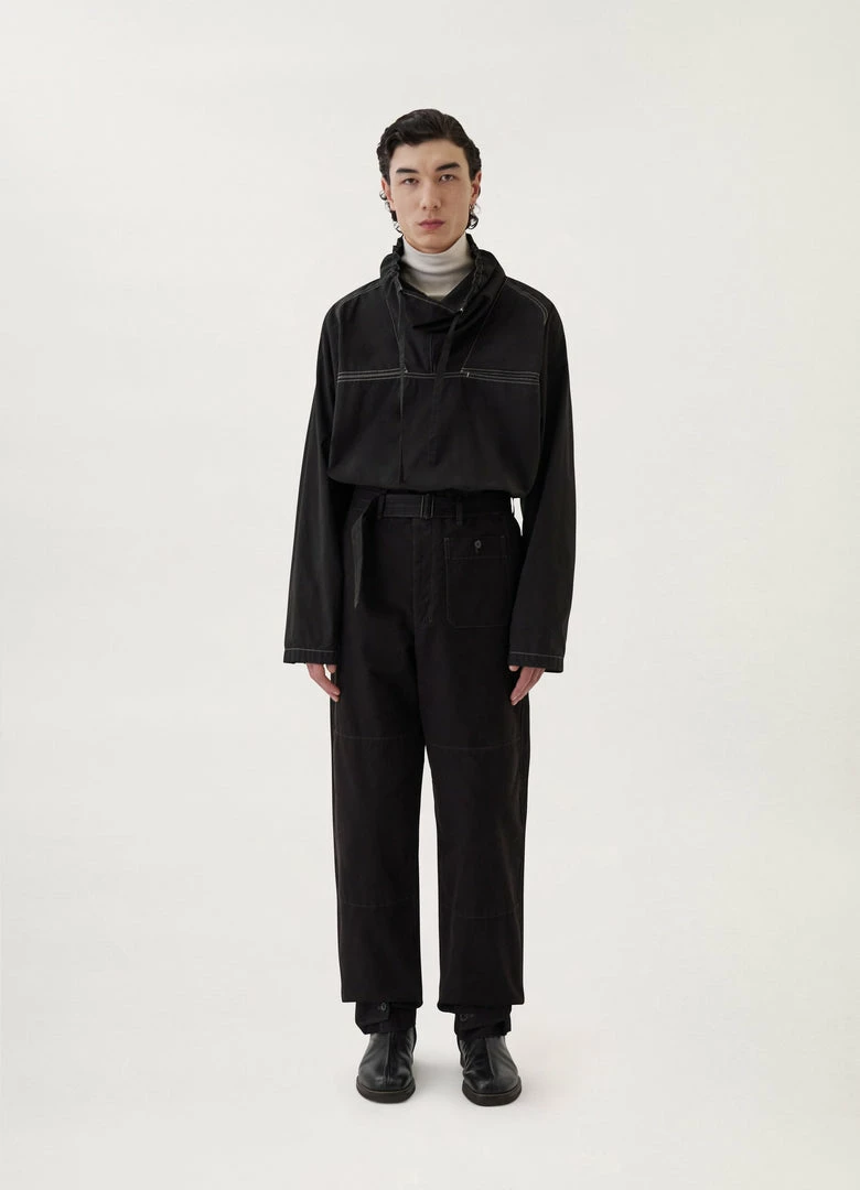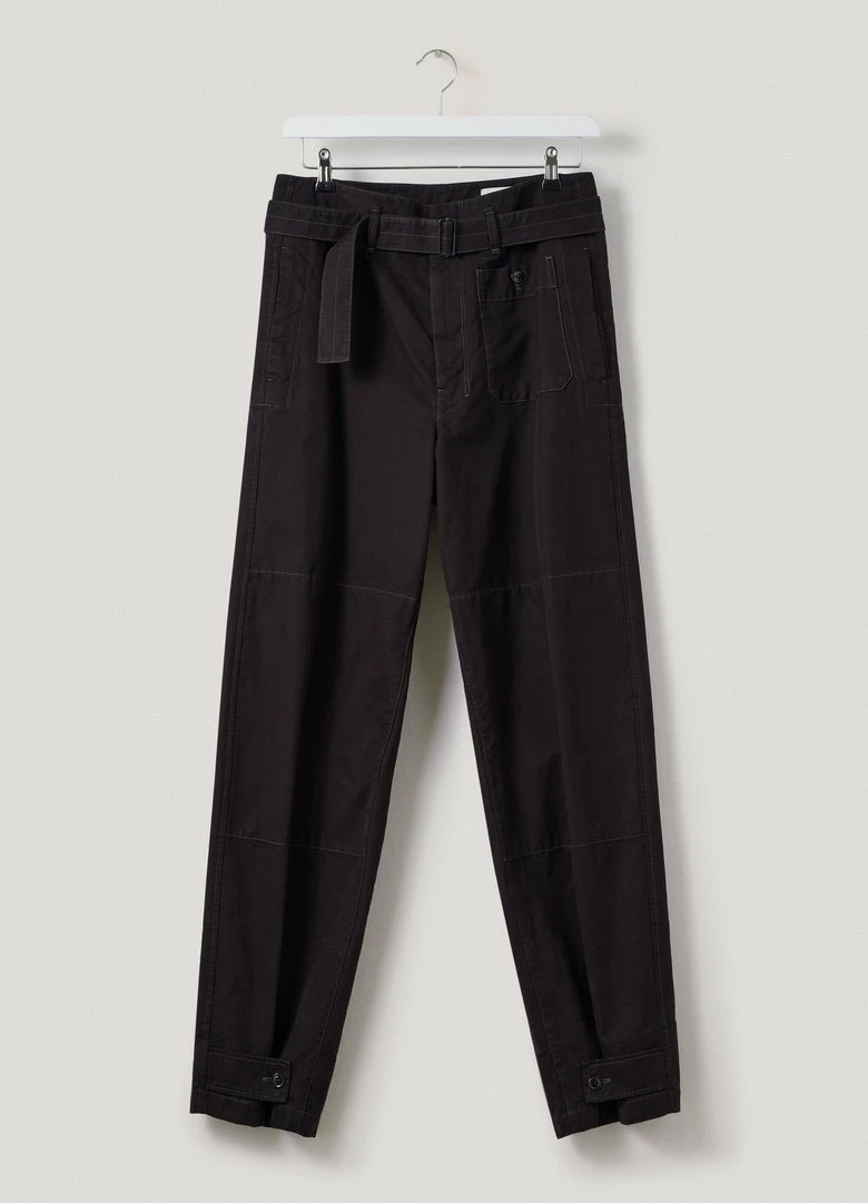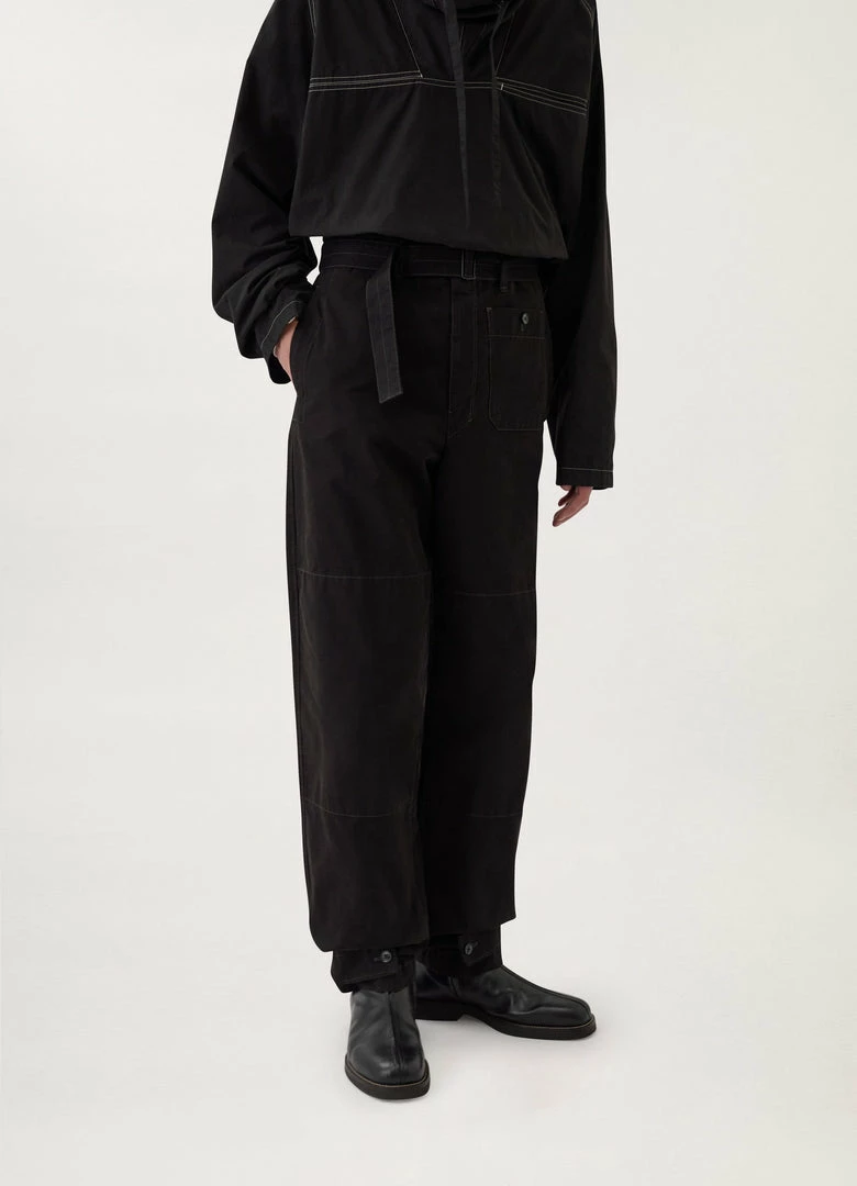 These garment-dyed pants are made of cotton canvas with a soft hand and a workwear quality, lending itself well to casual tailoring. Their intentionally large, high-rise waist is designed to be adjusted with the matching belt. Its details include two side-seam pockets, a buttoned patch pocket and one back welt pocket. The tapered leg features knee reinforcements, contrast stitching and an adjustable button-tab hem to taper it in.