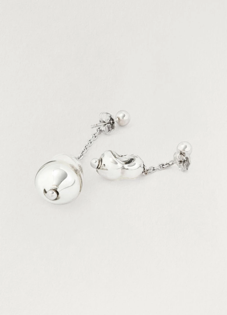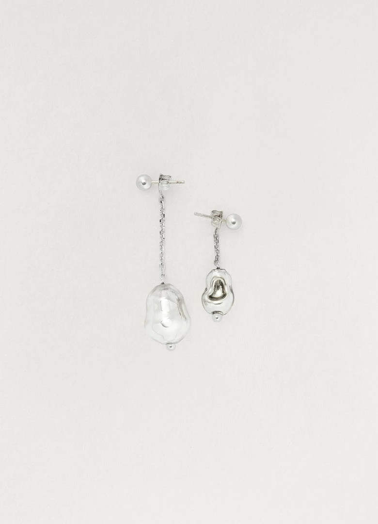 These asymmetric earrings feature hand-blown beads made artisanally in Lille in the north of France. Glass blowing is an artisanal technique that creates hollow shapes by blowing air into a heated glass pipe. The artisan creates a unique bubble that is only shaped by a short and gentle blow. Pearls are then enriched with a layer of silver. Each pearl of our Blown Glass Pearl earrings, is unique and varies in structure, shade and texture.