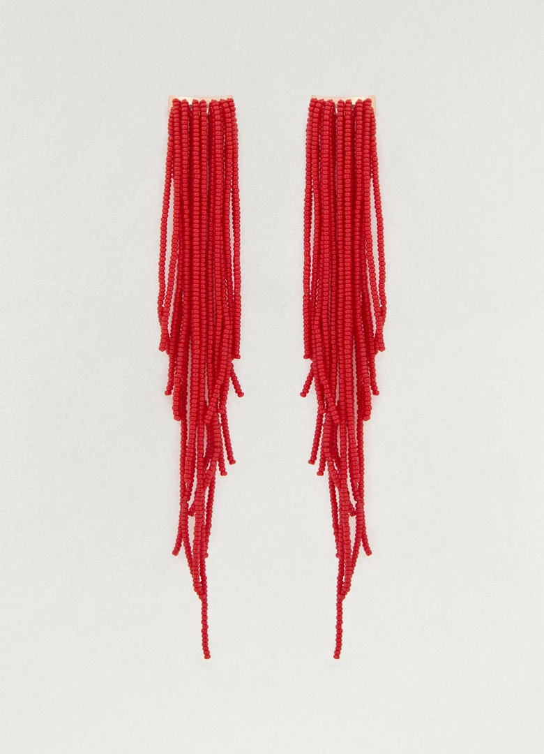 These earrings are made of multicoloured glass beads and tin hardware with a silver finish. These hand-crafted pieces are composed of thin strands of cascading beads that vary in length and are designed to move freely around the face.