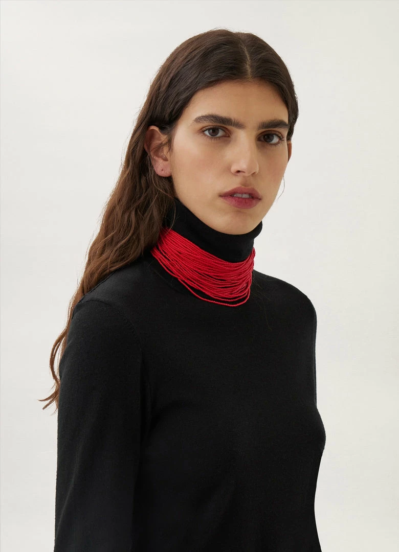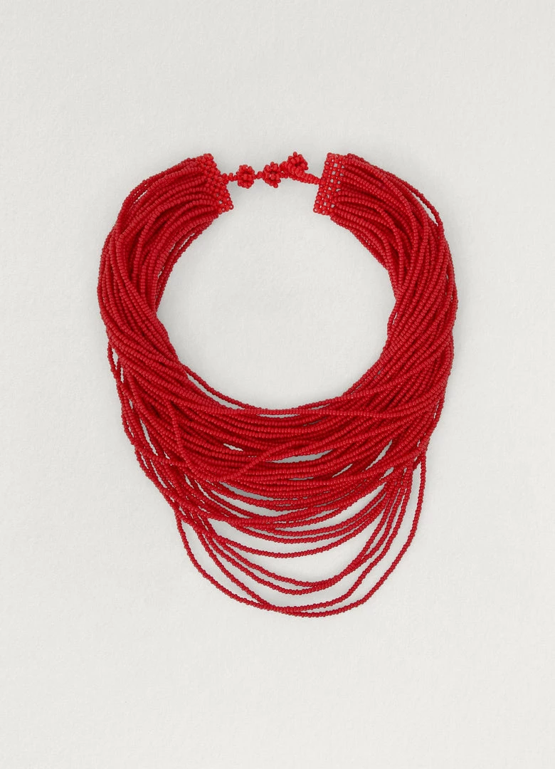 This necklace is made of multicoloured glass beads and tin hardware with a silver finish. This hand-crafted piece is composed of thin strands of beads that form a collar-like shape and is designed to move freely around the neckline.