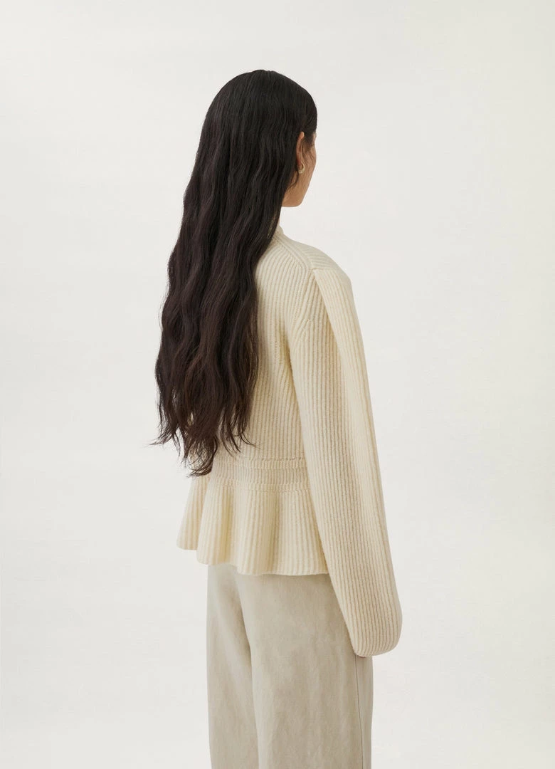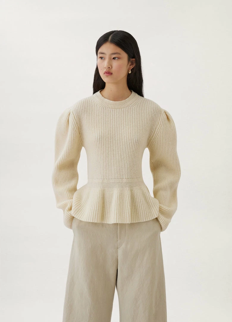 This sweater is knitted in soft Shetland wool, a Lemaire classic, with a dense yet lightweight feel and a rustic look. Its body is fitted and features a ribbed collar and pleated puffy shoulders. It has a tightly ribbed waist that extends into a ruffled peplum.