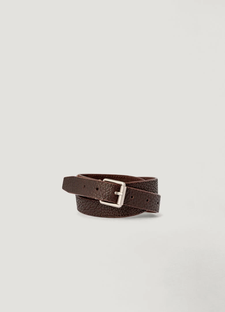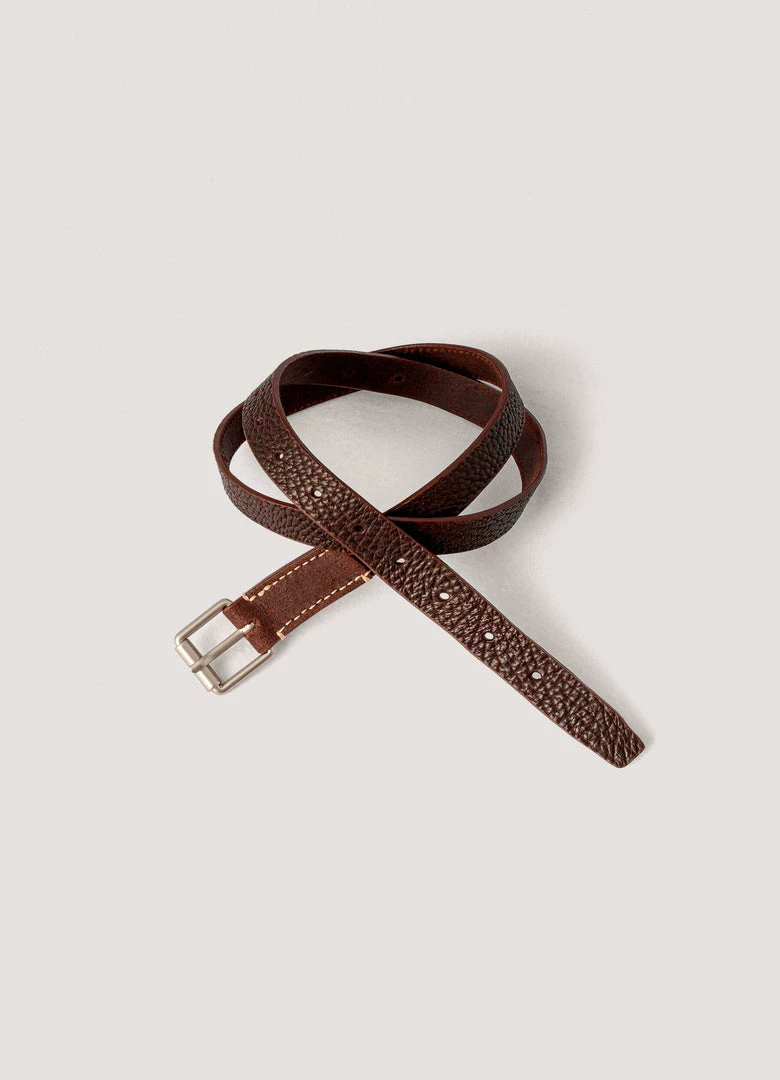 This thin belt is made of a thick grained vegetable-tanned leather with a compact grain. Its reverse is hand-stitched with a contrasting thread.