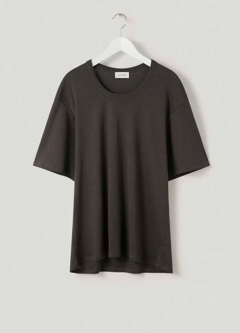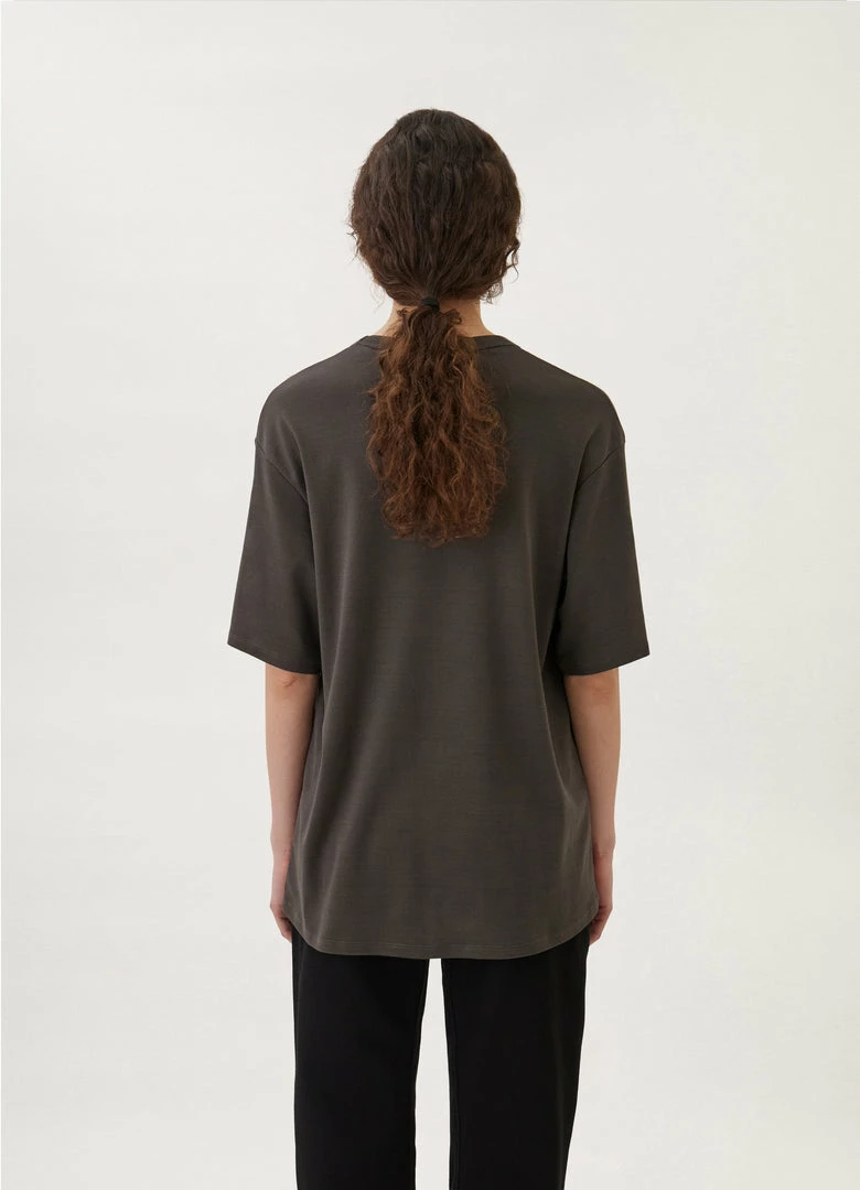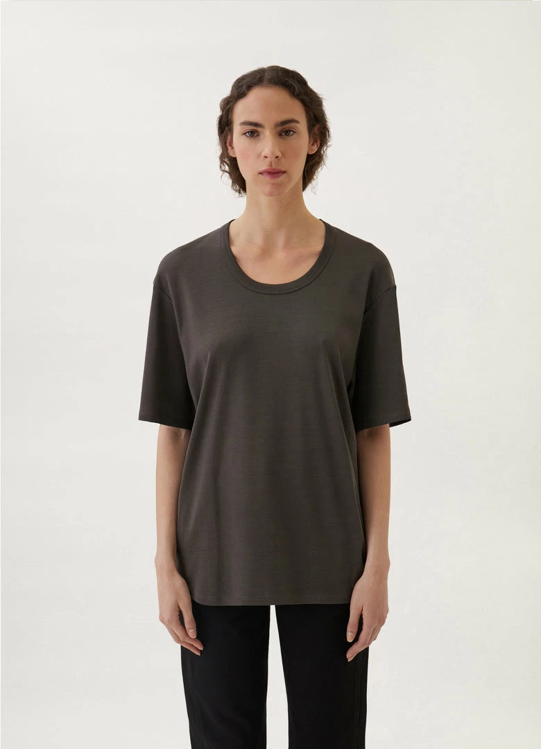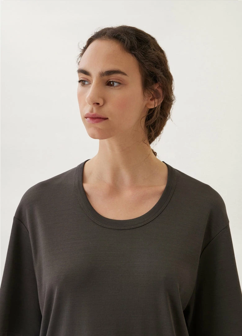 This t-shirt is made of a medium-weight cotton jersey with a fine quality. It has a relaxed, loose fit with a wide u-shaped neckline in front that comes up higher in the back, and wide, elbow-length sleeves.