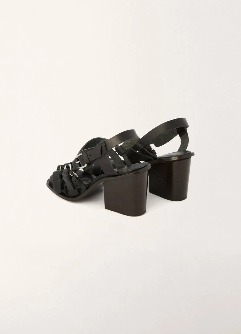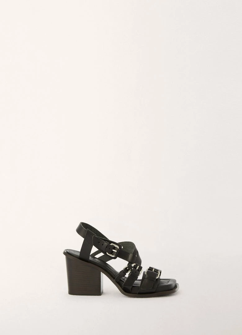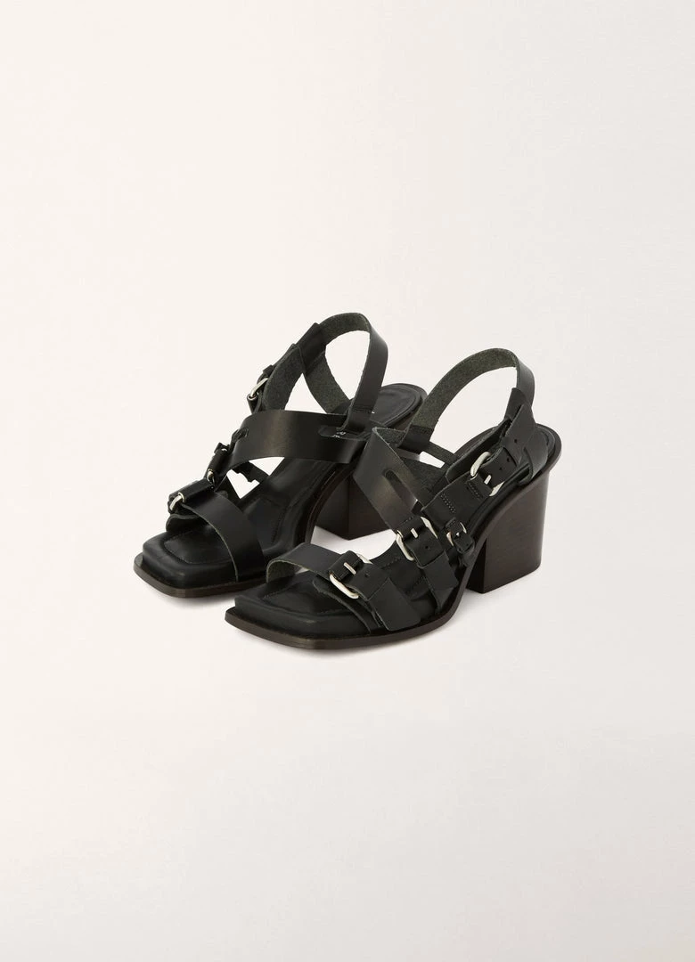 These sandals are made of vegetable-tanned leather with a compact grain and a smooth finish. They are composed of multiple straps that cross-over the foot asymmetrically, closing with three small buckles. They have a partially rounded heel, a square toe and a padded sole for added comfort.