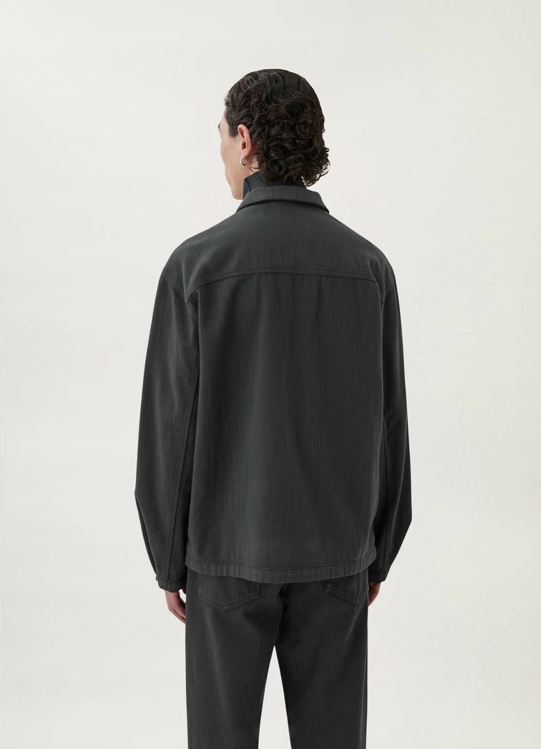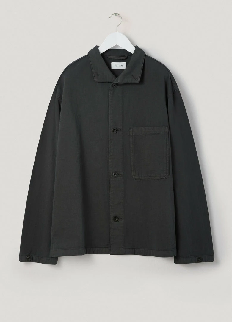 This overshirt is made of garment-dyed denim – a classic Lemaire fabric with a round, medium-weight hand. Its cut is boxy and straight with a heavier fabrication that can be worn as a light jacket or as a shirt and features a convertible stand collar. Its workwear-inspired details include a chest patch pocket, triple stitching, and adjustable button cuffs.