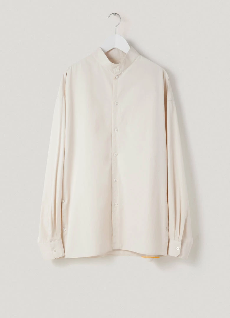 This shirt is made of a heavy poplin for a warmer wear, with a smooth surface woven from organic cotton yarn. Its adjustable fit is inspired by Lemaire’s classic Twisted theme, allowing the front to be worn straight or with its volume shifted to the side. Its details include a stand collar and a button placket which can be closed over the hip, wrapping around the waist.