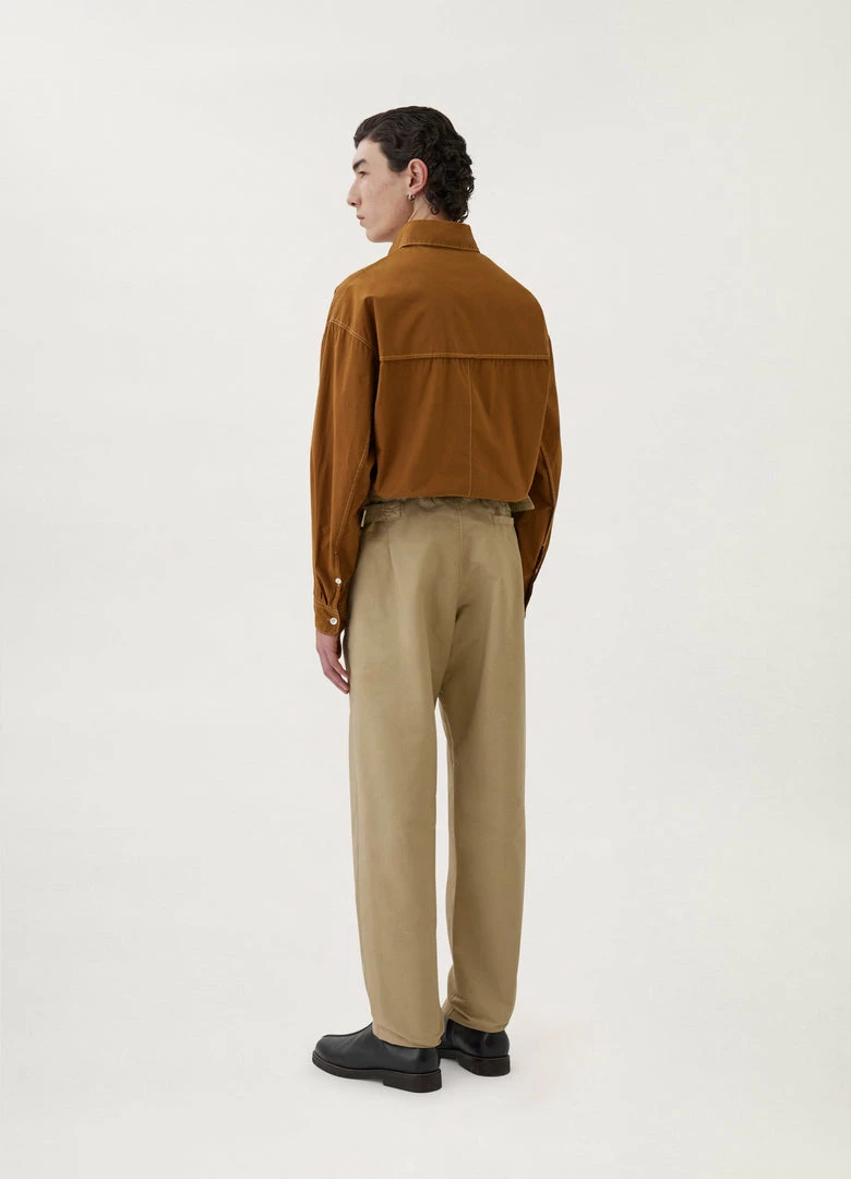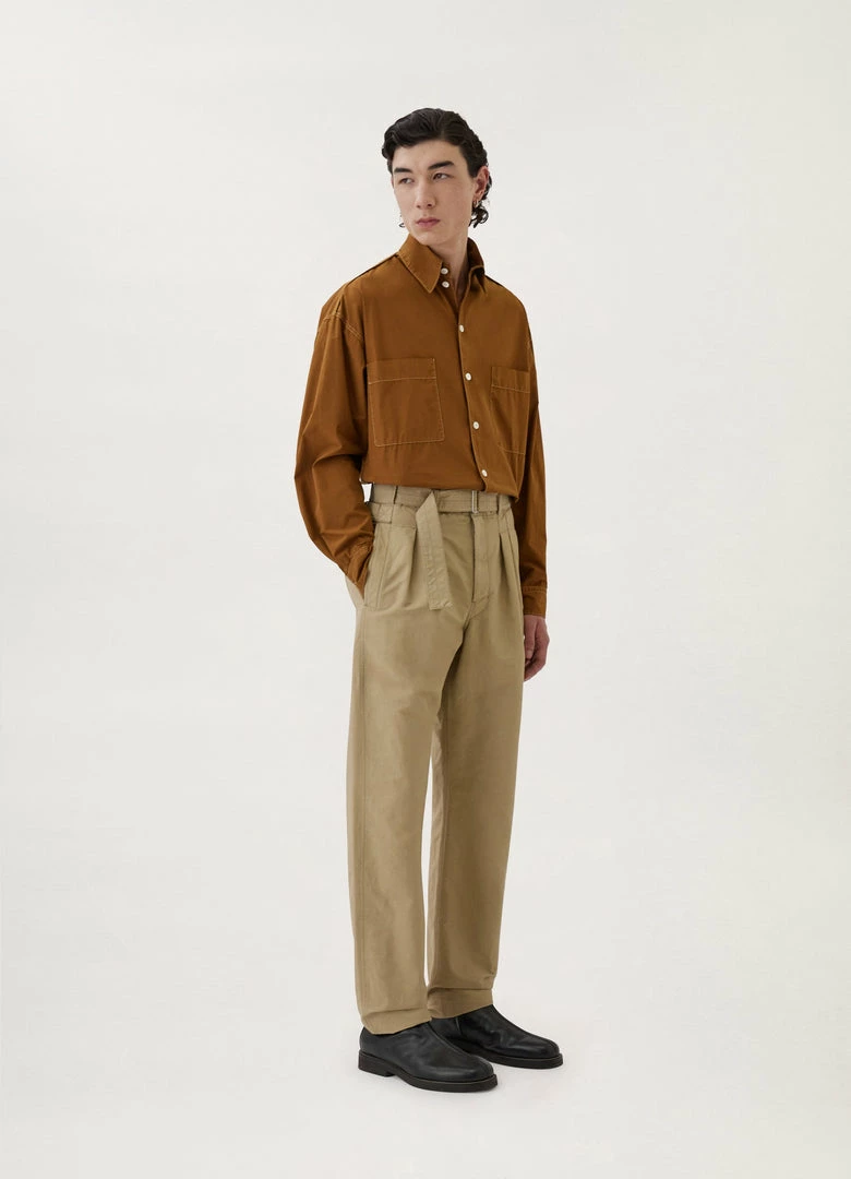 These garment-dyed pants are made of a cotton-nylon blend with a twill weave and a light, water-repellent coating. The wide, mid-rise waist can be adjusted with the matching belt. The leg is tapered and pleated, twin stitching outlining its construction. Other utility details include two side-seam pockets, a back welt pocket and side-adjusters to adjust the waist without the belt.