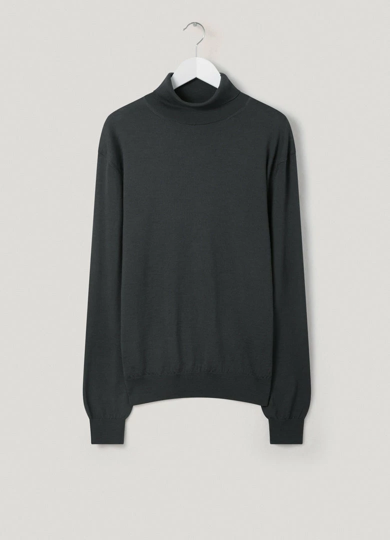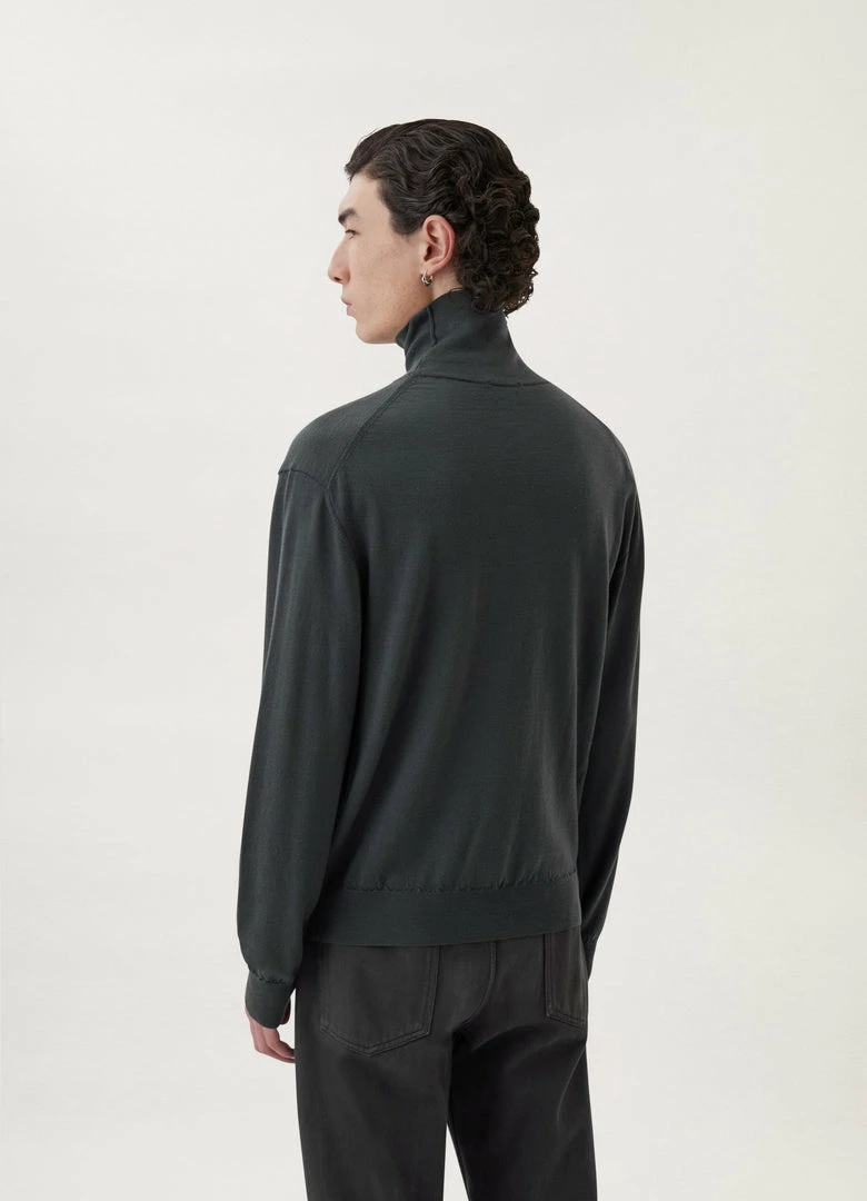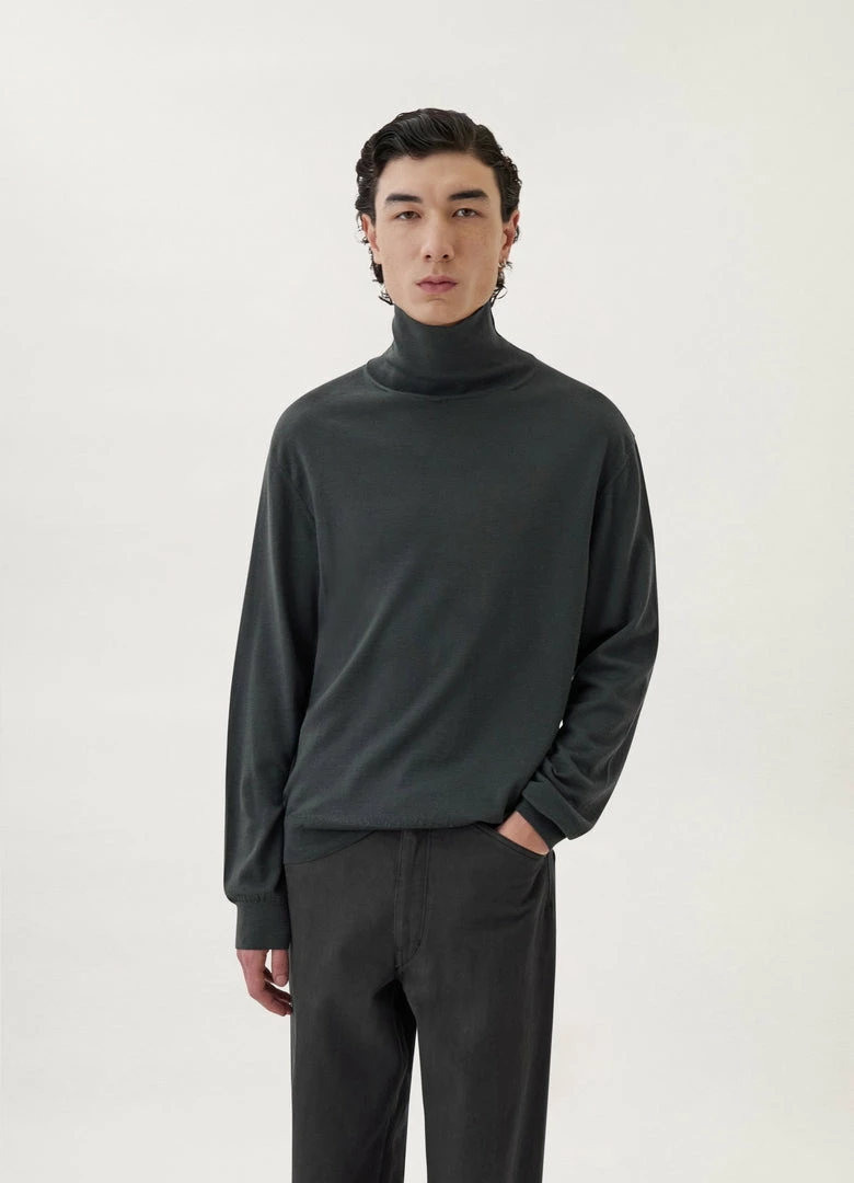 This sweater is made of an extrafine merino wool blend with a sleek, lightweight quality and a tight rib knit. It has a classic, straight body with a high, ribbed collar and cuffs. It can be worn on its own or layered for additional warmth.