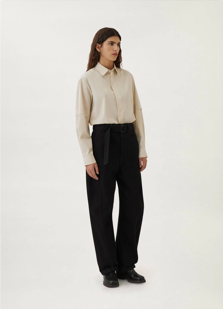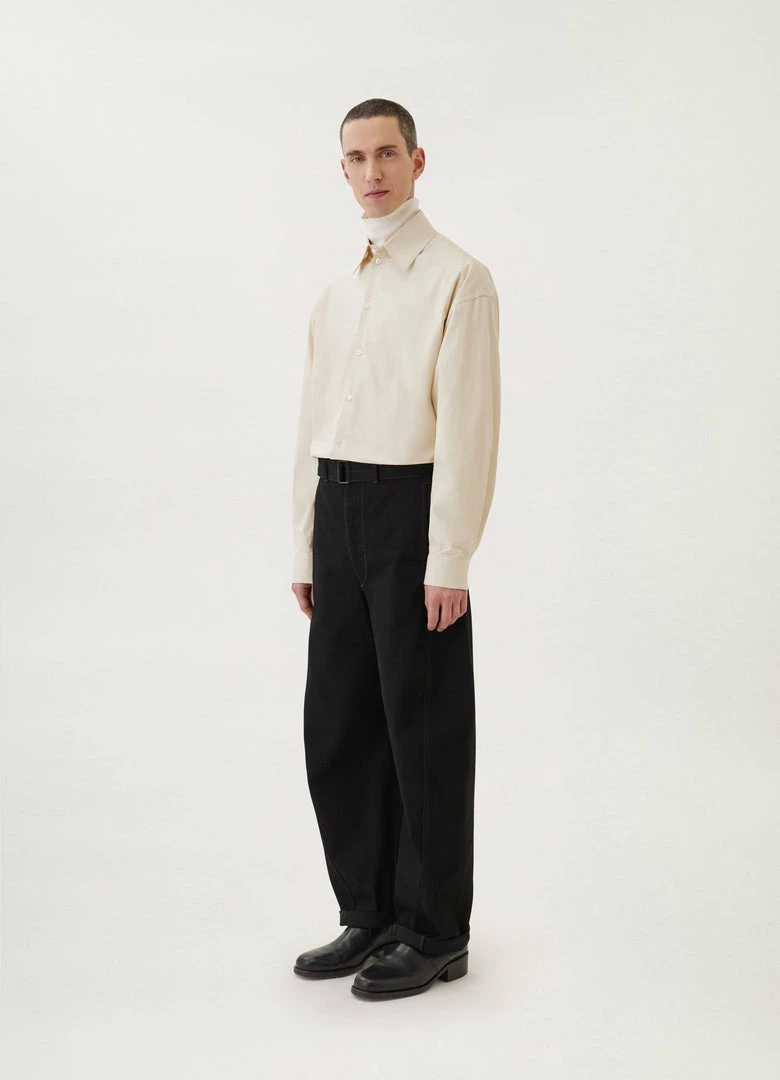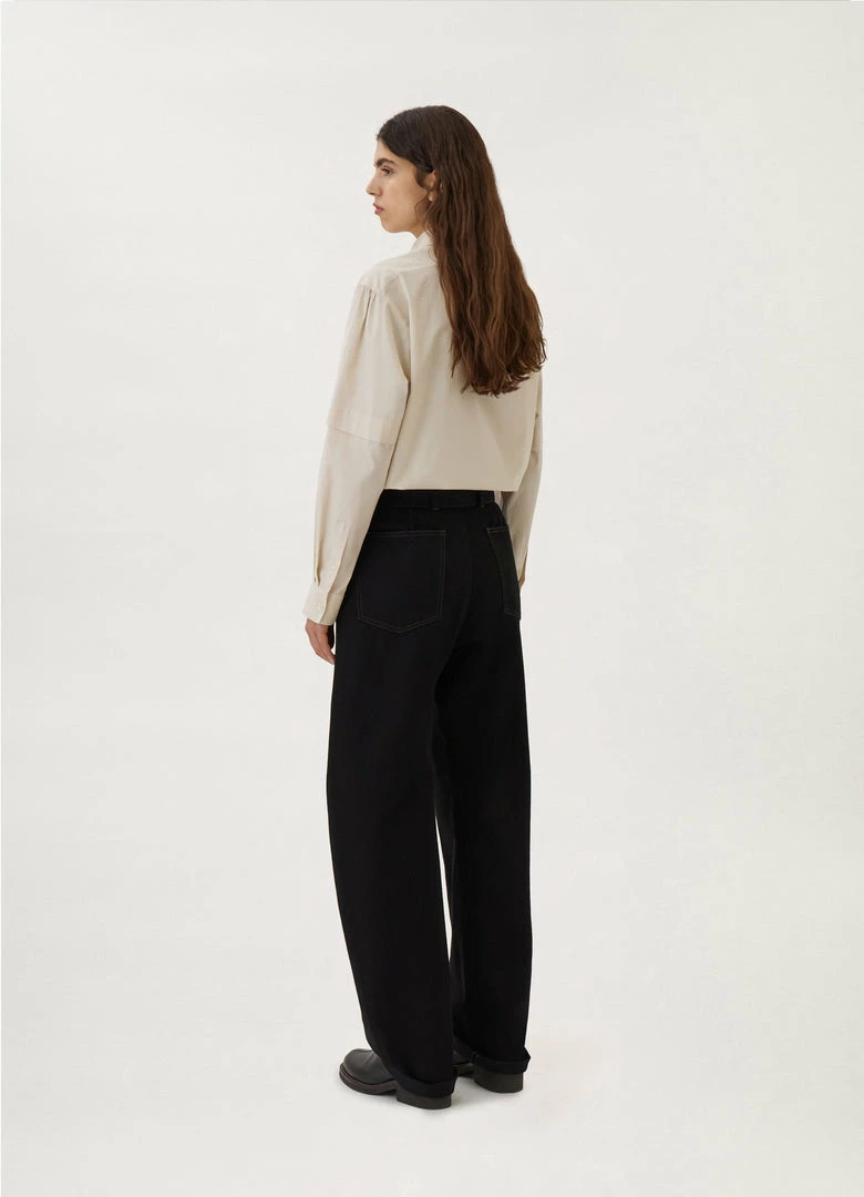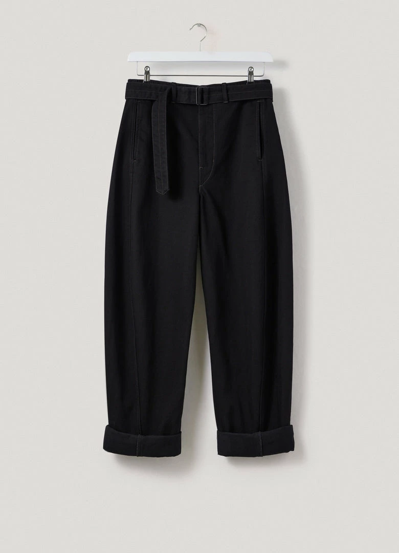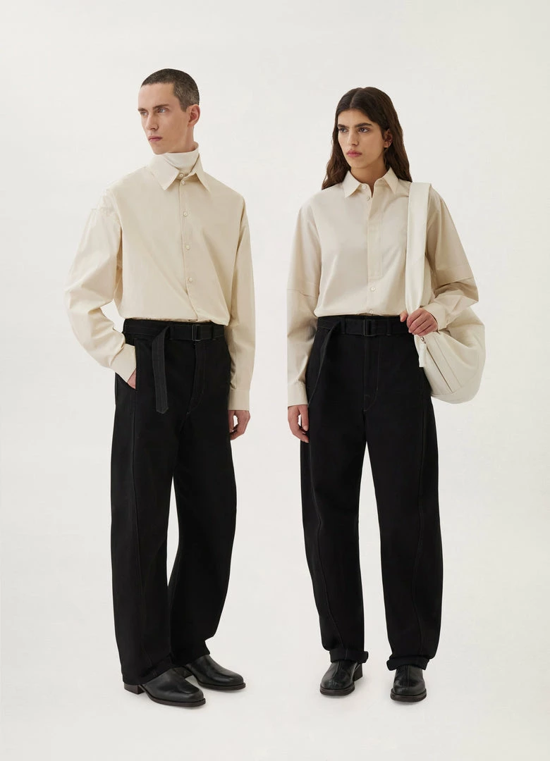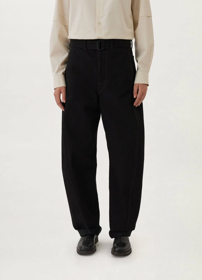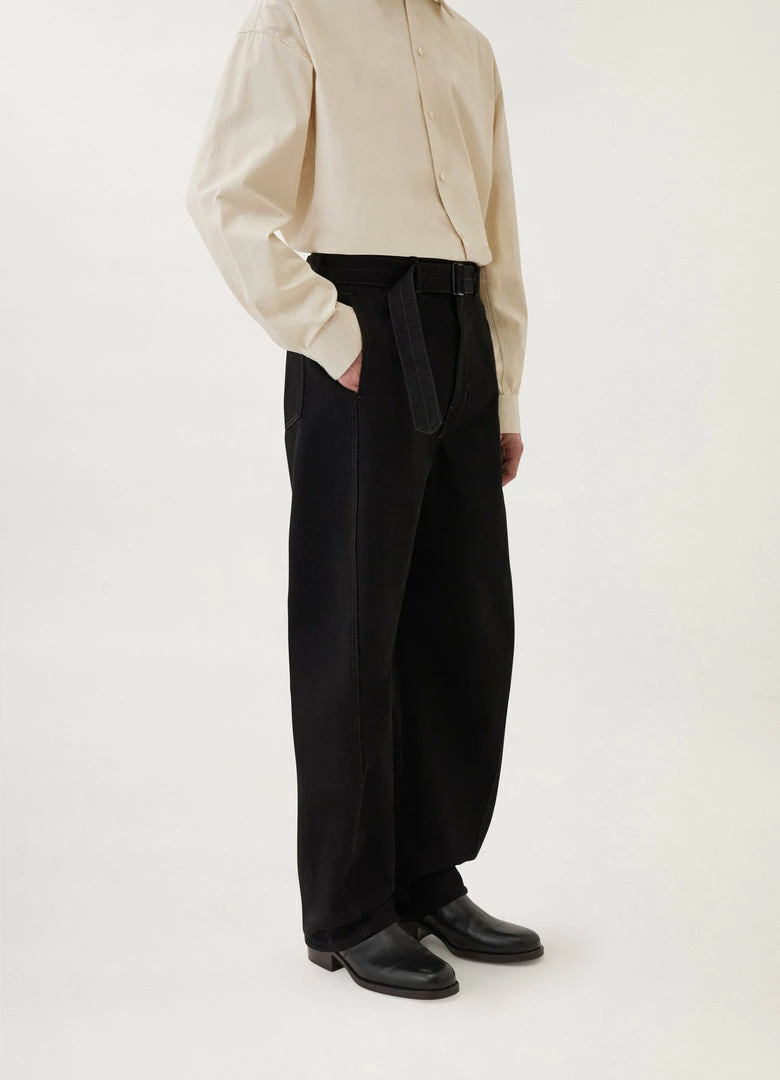 A new version of the classic Lemaire Twisted Pants, these unisex pants are made of heavy denim with a visible twill weave and a deep black wash. Their side-seams are slightly twisted giving the leg a curved shape. Details include two side pockets, back patch pockets and contrast stitching. The fit is elongated and mid-rise and includes a matching belt to adjust the waist.