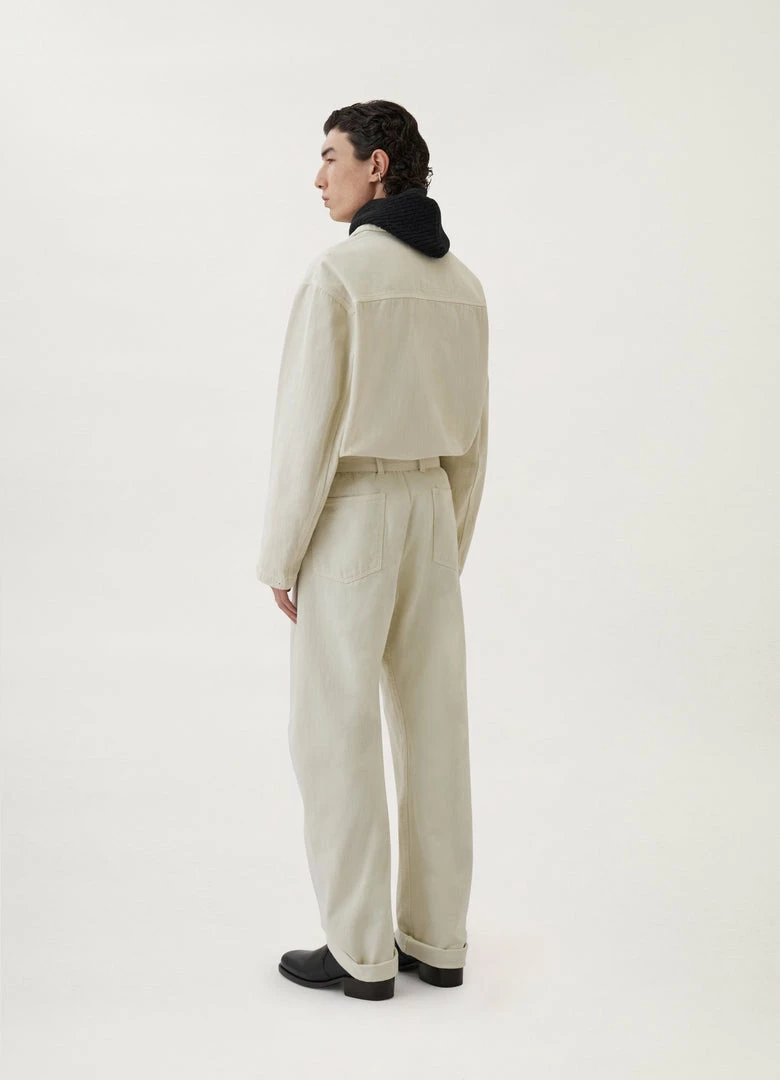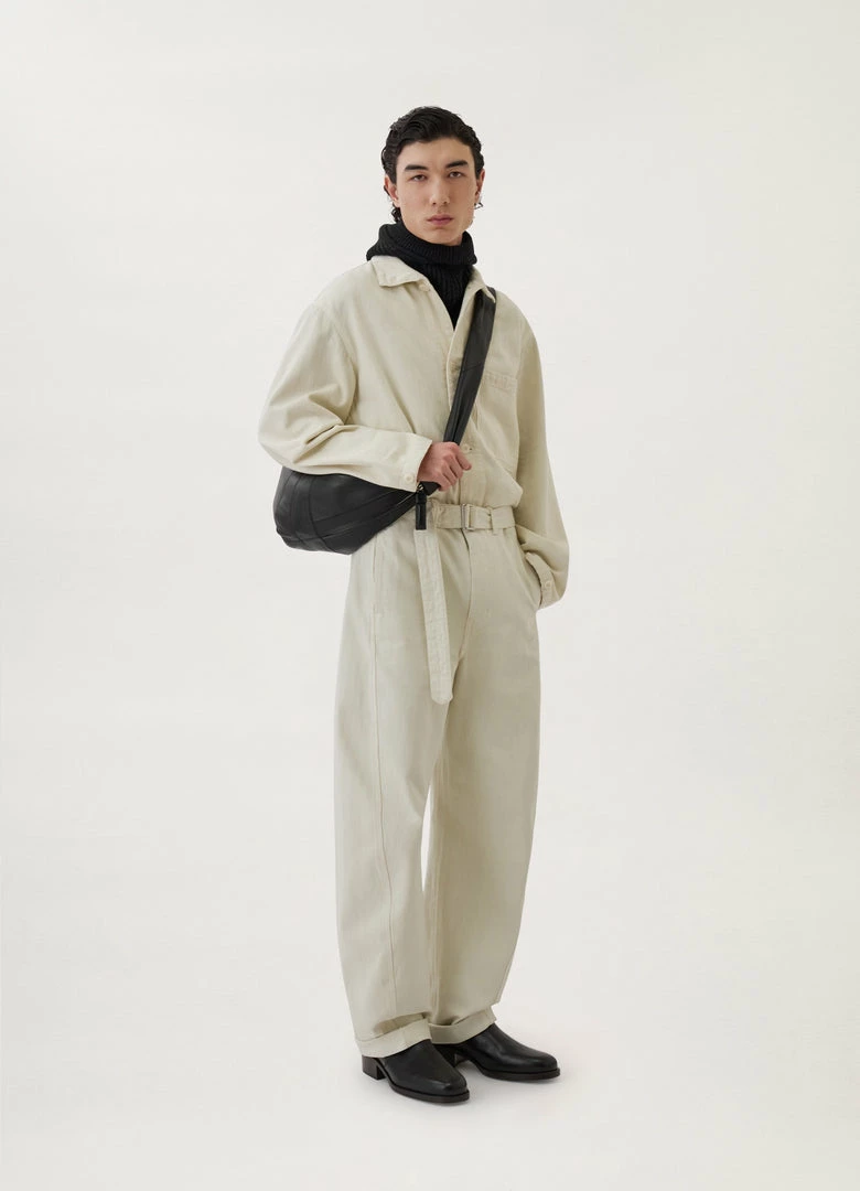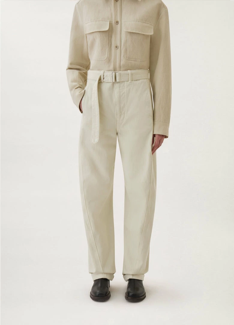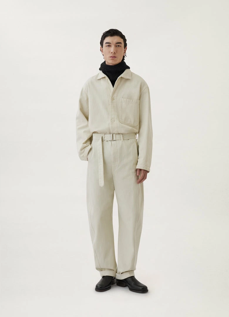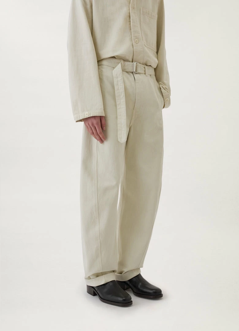 A new version of the classic Lemaire Twisted Pants, these unisex pants are made of garment-dyed denim – a classic house fabric with a thick, round hand. Their side-seams are slightly twisted giving the leg a curved shape. Details include two side pockets, back patch pockets and contrast stitching. The fit is elongated and mid-rise and includes a matching belt to adjust the waist.
