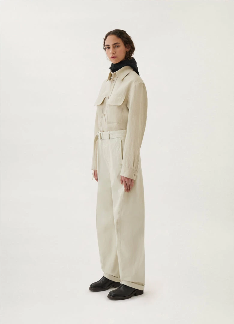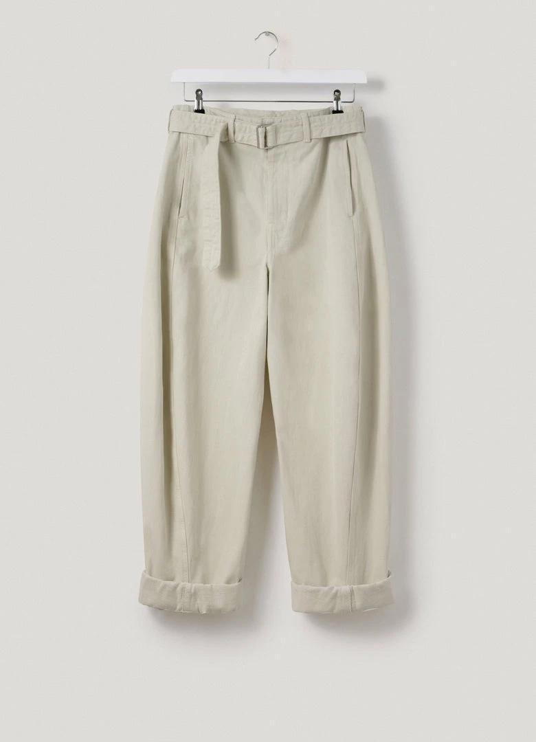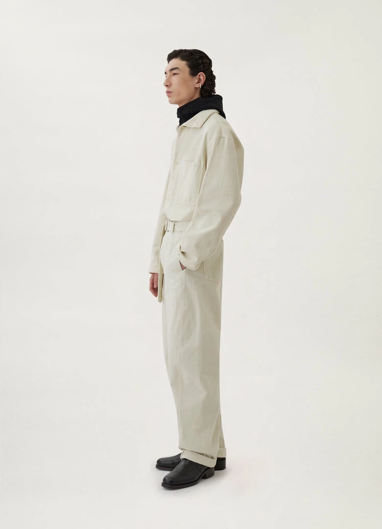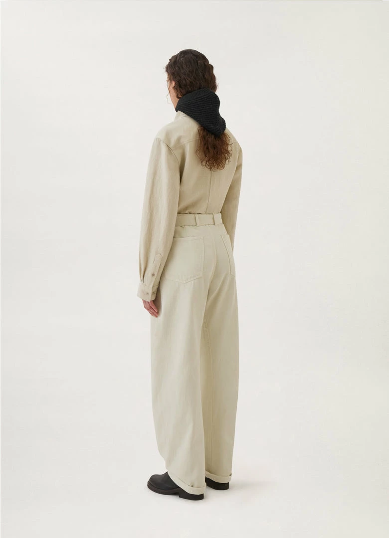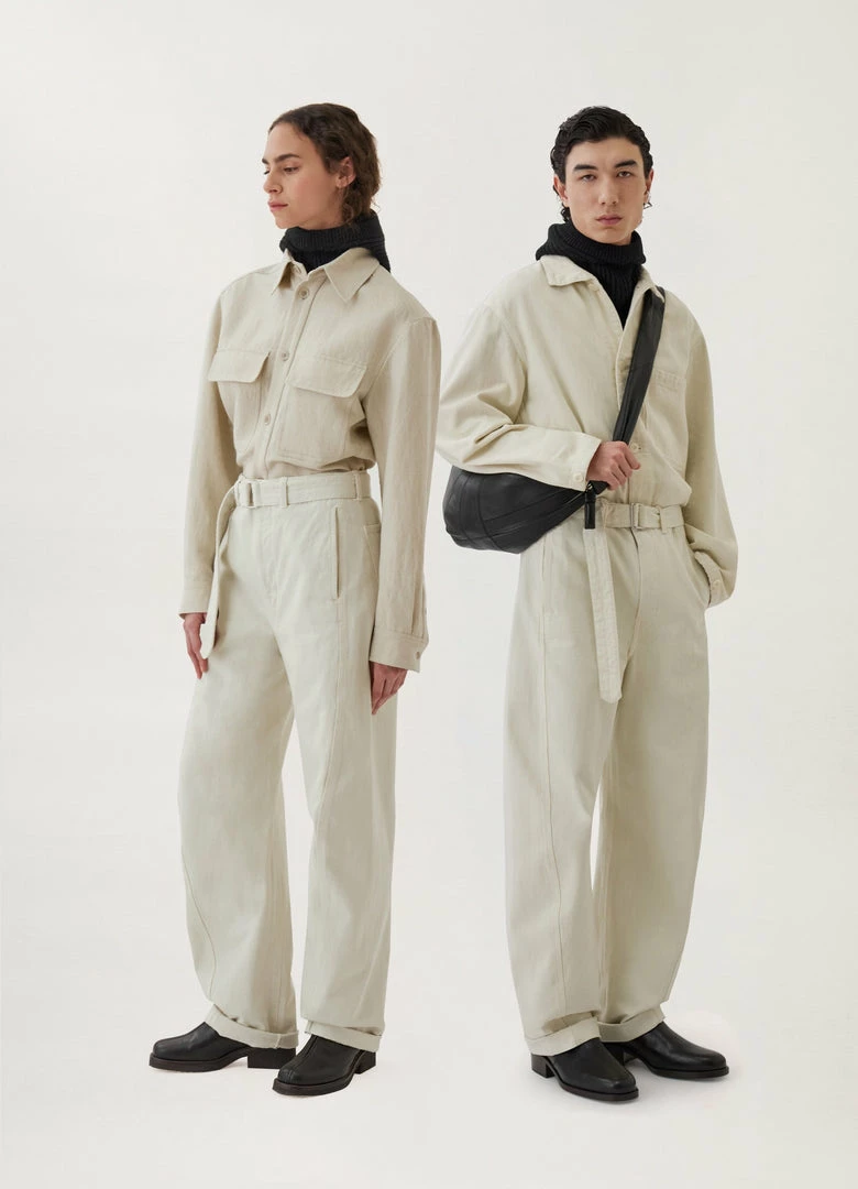 A new version of the classic Lemaire Twisted Pants, these unisex pants are made of garment-dyed denim – a classic house fabric with a thick, round hand. Their side-seams are slightly twisted giving the leg a curved shape. Details include two side pockets, back patch pockets and contrast stitching. The fit is elongated and mid-rise and includes a matching belt to adjust the waist.