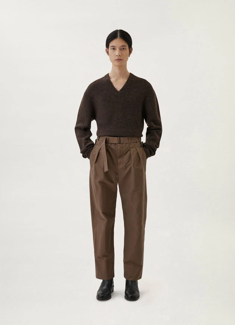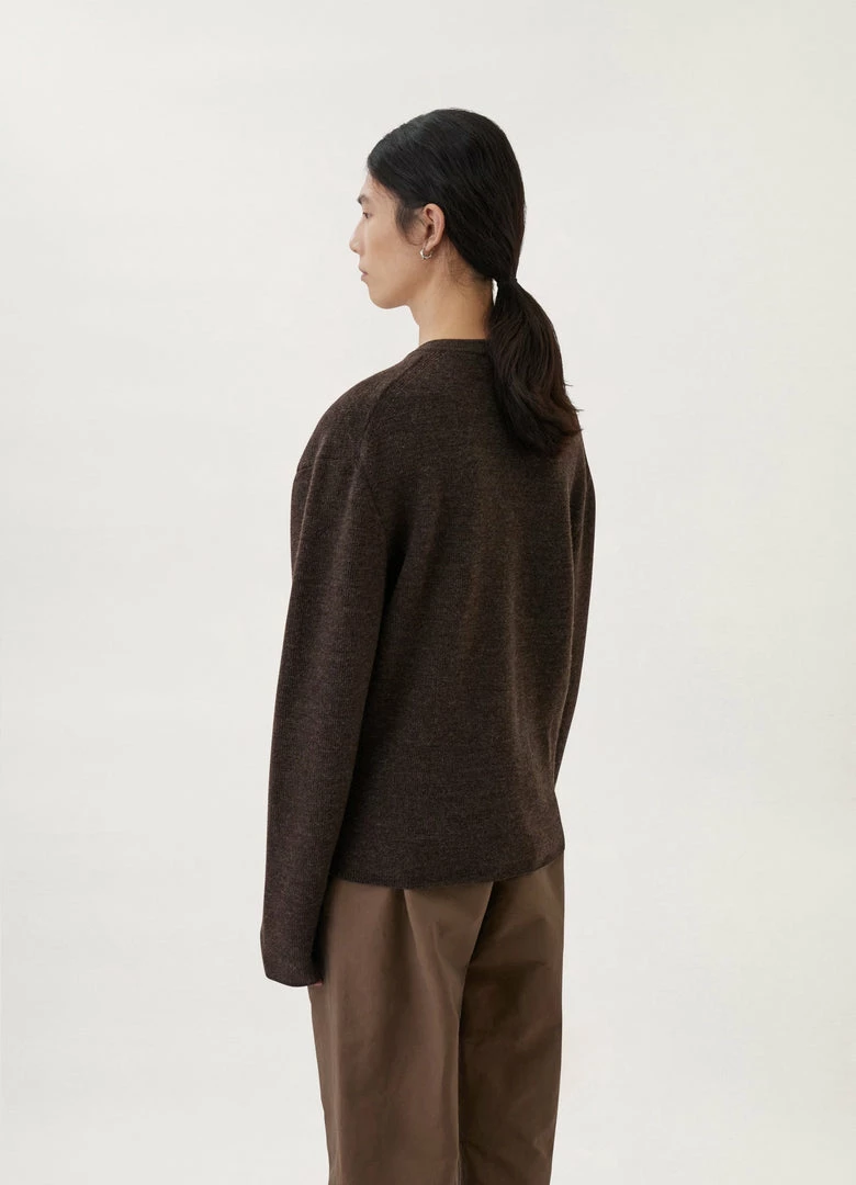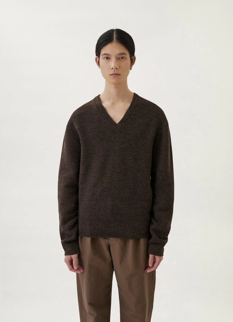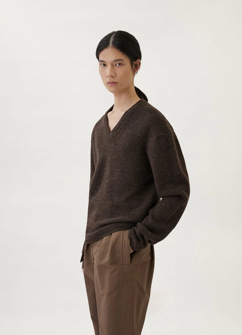 This sweater is knitted in compact, medium-weight wool with a dry, military feel. It has a straight, relaxed fit that is accentuated by a wide V-neckline and slightly dropped shoulders. Details include a ribbed collar and self-start sleeves and hem.