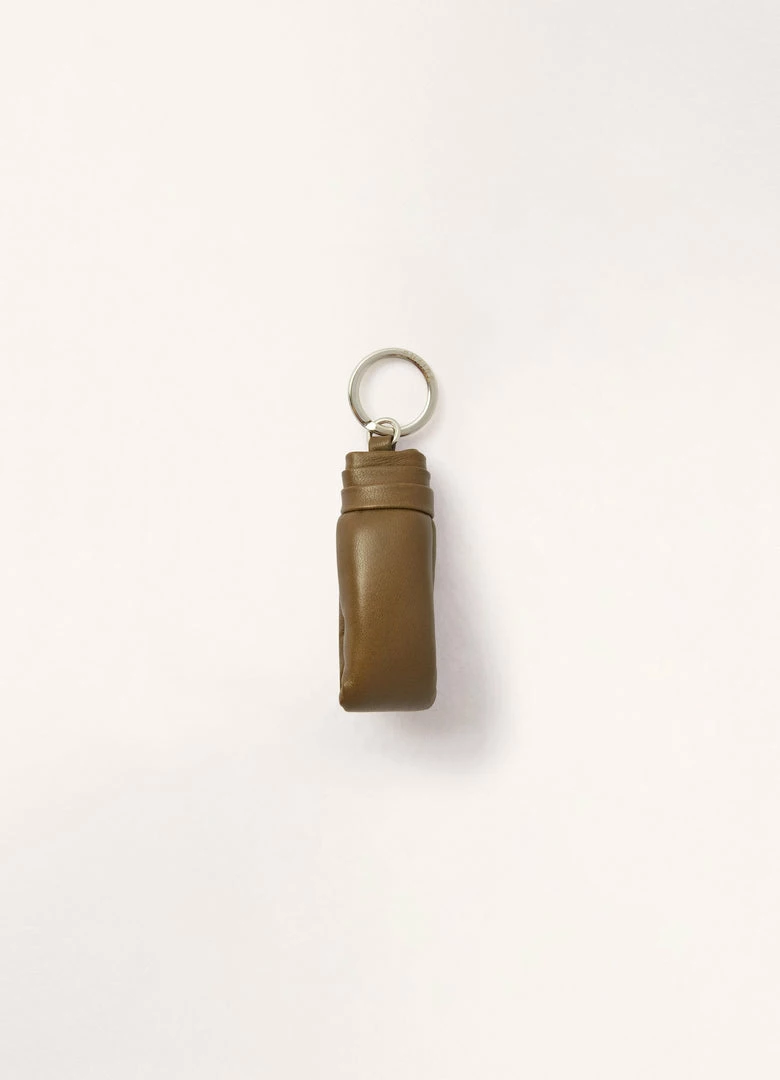 Inspired by the Croissant family, this keychain is made of smooth lamb nappa leather with a soft touch. Its wadded leather zipper pull refers to the finishing detail on the LEMAIRE Croissant bag.