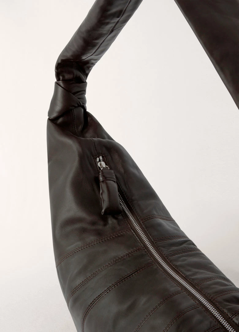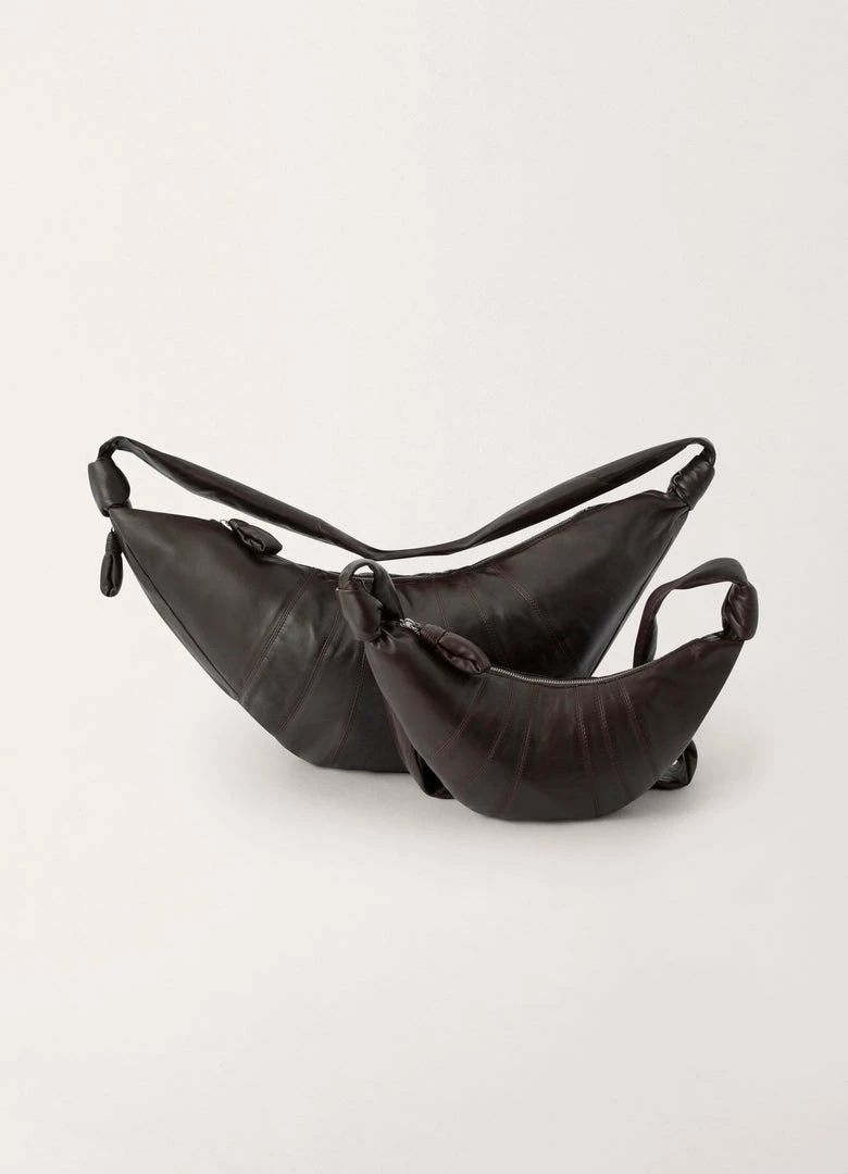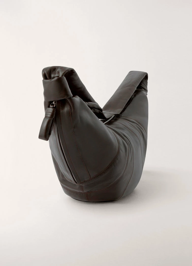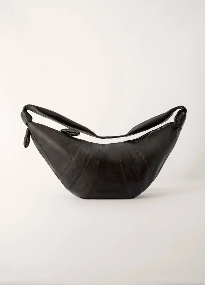 This classic LEMAIRE bag, the second largest of the Croissant bag family, is made of smooth nappa leather with a soft touch. Inspired by the shape of a croissant pastry, the bag’s design is achieved through an assembly of topstitched cutouts. Its ergonomic shape wraps around the body for an easy, casual wear. It features a metal zipper, side knot finishings, a side zipped pocket and a removable A5 pouch. It can be worn as a shoulder or crossbody bag. Its material softens over time, allowing each bag to mold to its wearer.