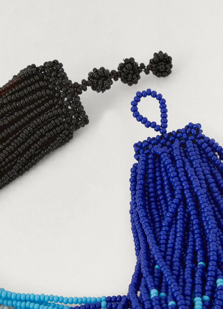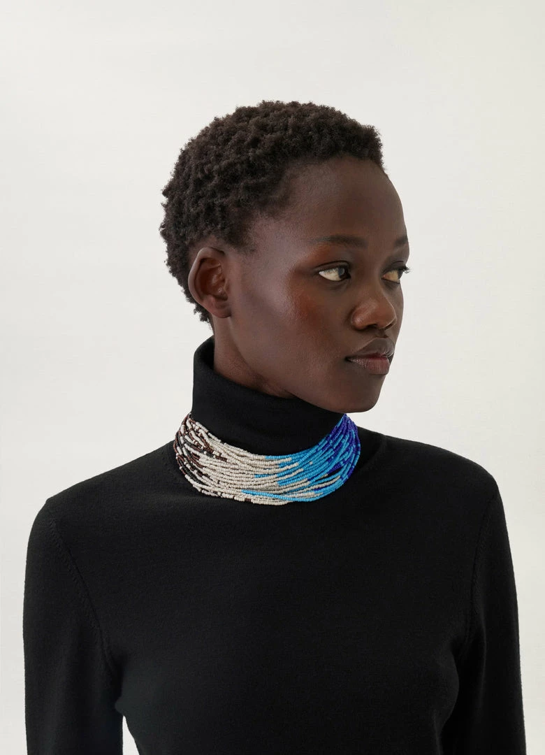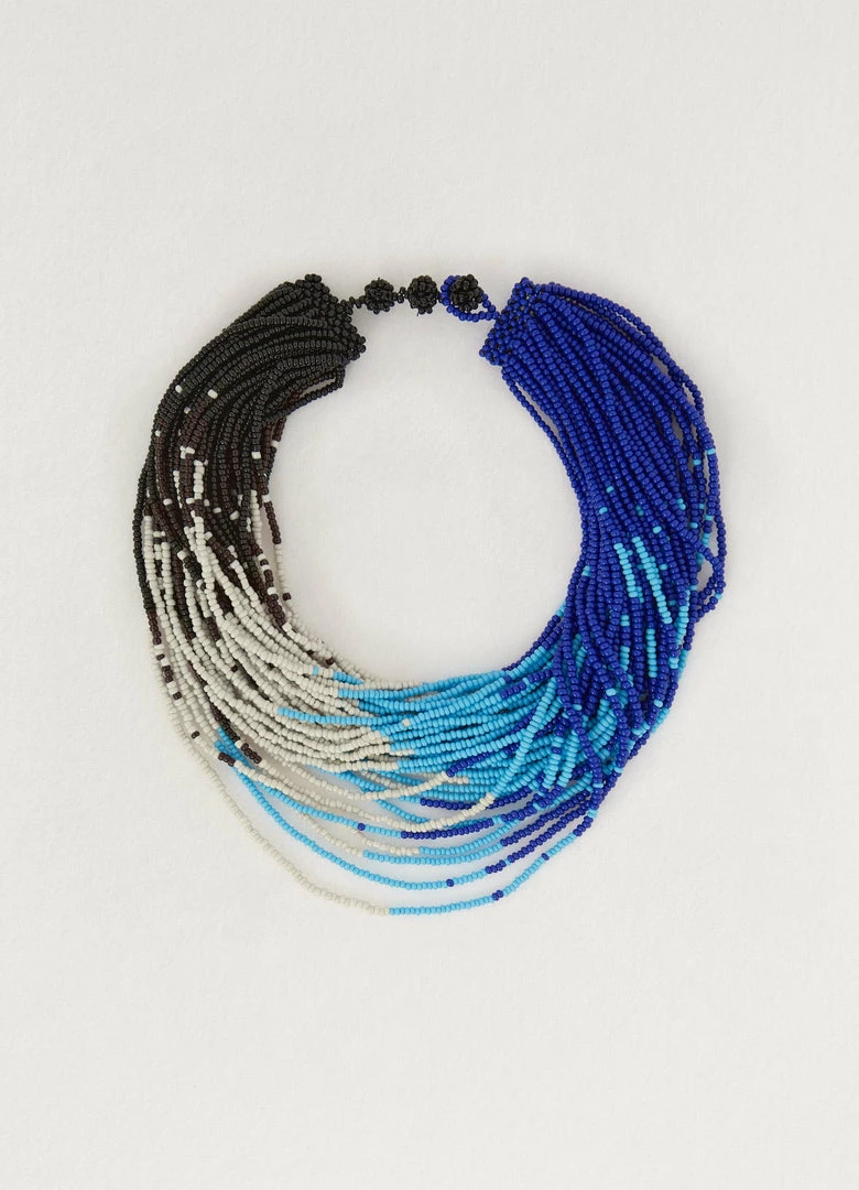 This necklace is made of multicoloured glass beads and tin hardware with a silver finish. This hand-crafted piece is composed of thin strands of beads that form a collar-like shape and is designed to move freely around the neckline.