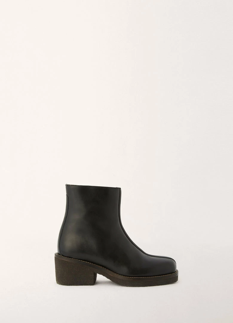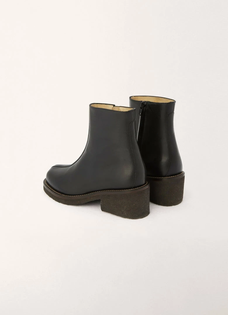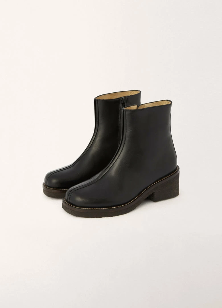 These boots are made of vegetable-tanned leather with a compact grain and a smooth finish. They are based on the classic Lemaire Piped Slippers, designed as an ankle boot. They are composed of two pieces of leather that are sewn together from the ankle to the rounded toe, with a platform for additional comfort.