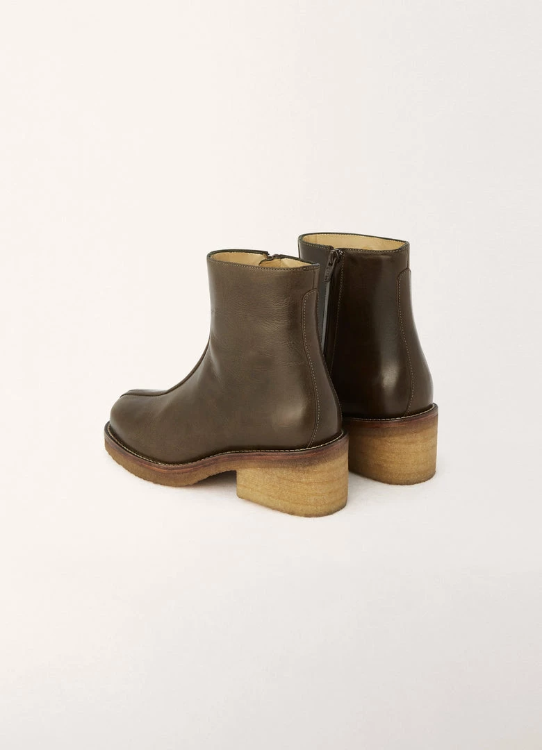 These boots are made of vegetable-tanned leather with a compact grain and a smooth finish. They are based on the classic Lemaire Piped Slippers, designed as an ankle boot. They are composed of two pieces of leather that are sewn together from the ankle to the rounded toe, with a platform for additional comfort.