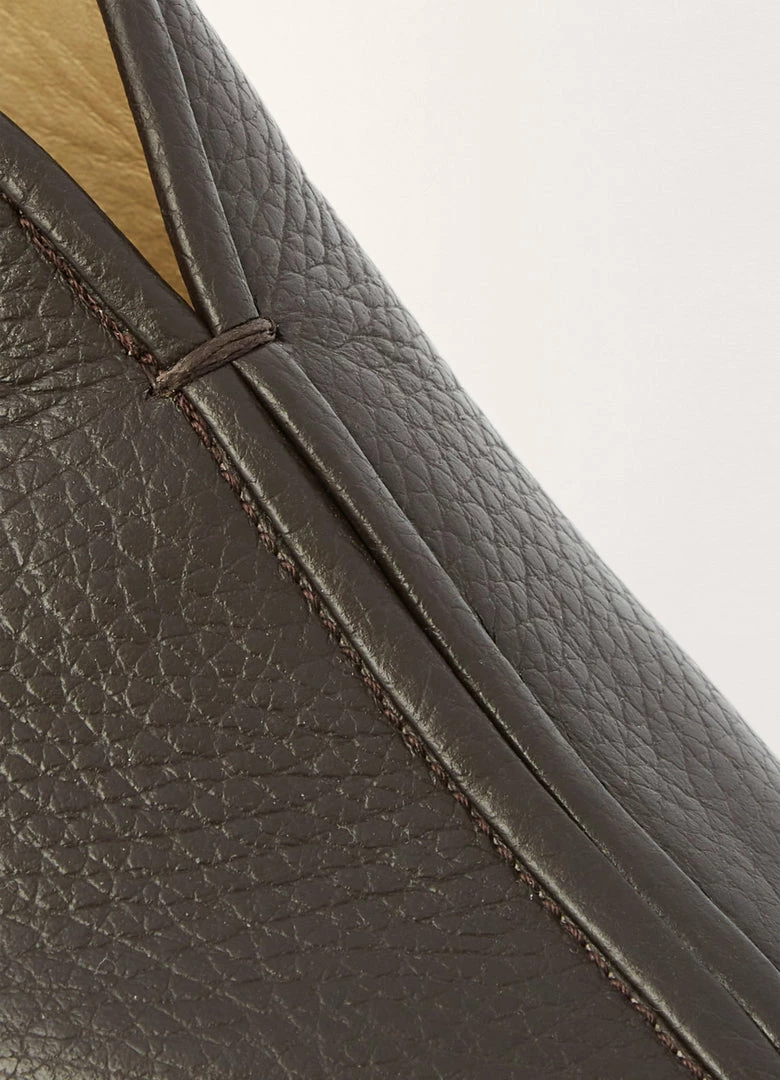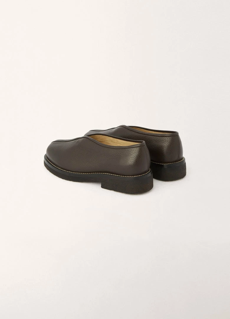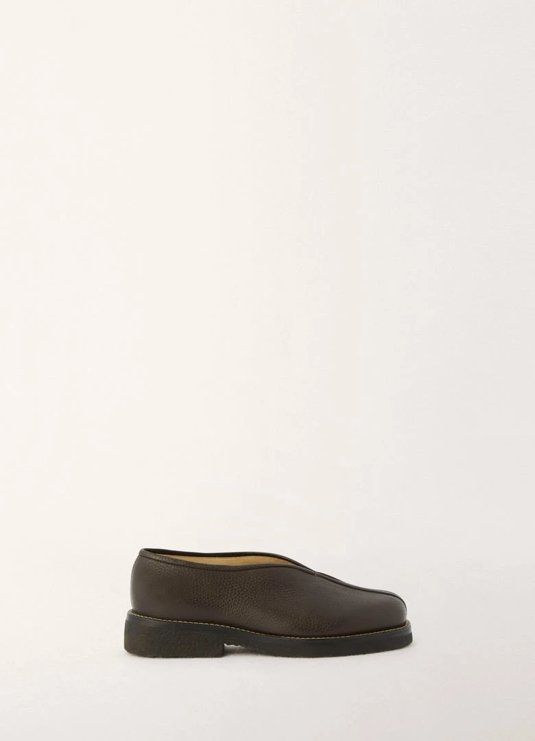 These shoes are made of deep grained leather with a soft shine. This classic Lemaire shape has a simple construction composed of two pieces of leather that are sewn together on the front. A square toe and crepe sole add to their flexibility. They feature stitching and piping details.