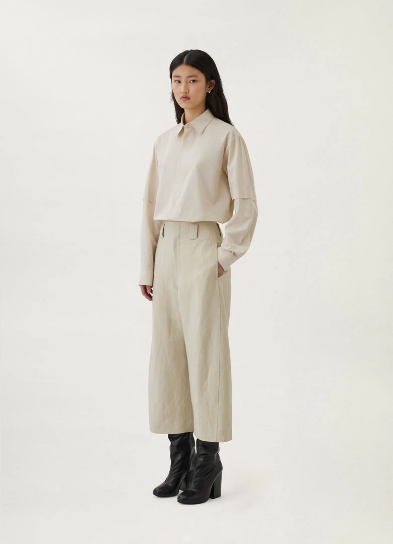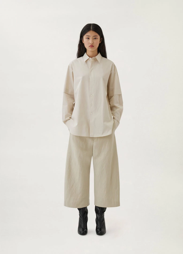 This shirt is made of a heavy poplin for a warmer wear, with a smooth surface woven from organic cotton yarn. It has a trompe-l’oeil construction evoking a short-sleeved shirt layered over a long-sleeved one. It features a classic shirt collar that extends into a partially concealed placket with three visible buttons. Workwear-inspired details include rounded side slits, a back yoke, and contrast stitching.