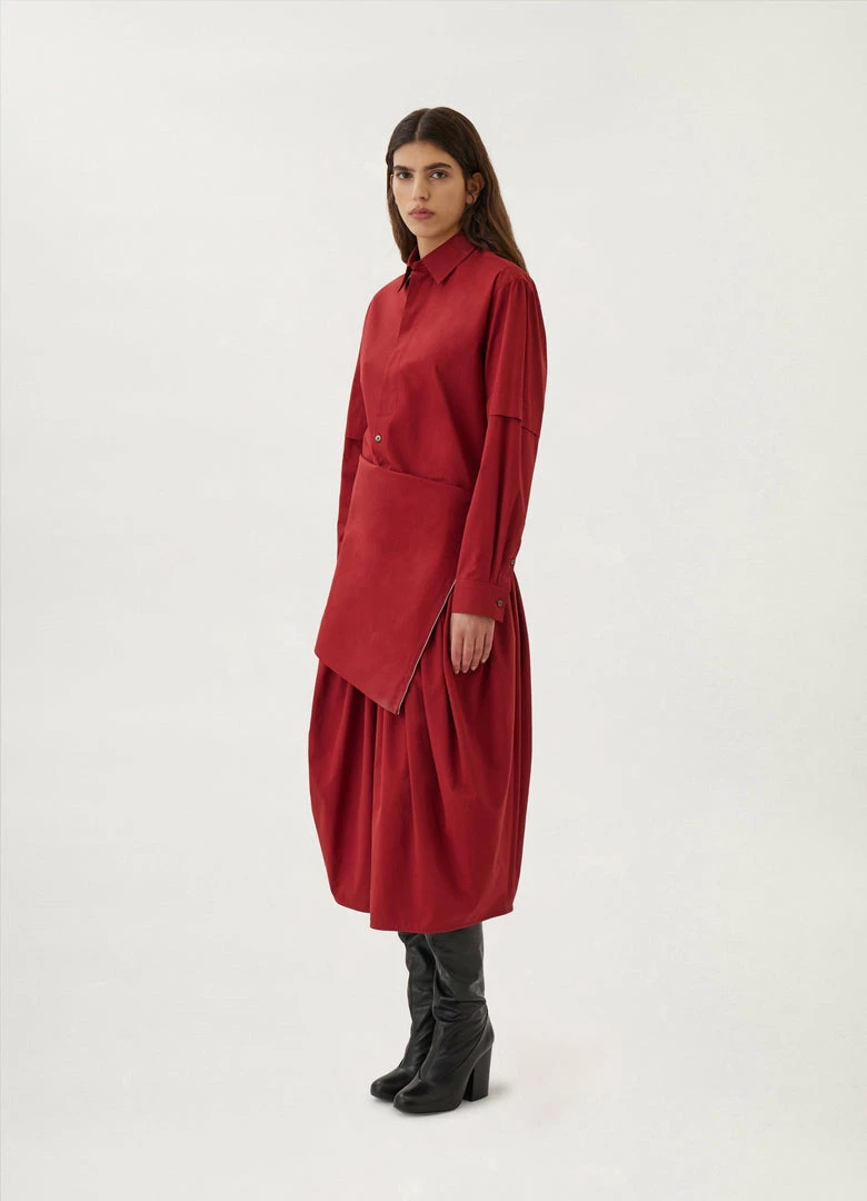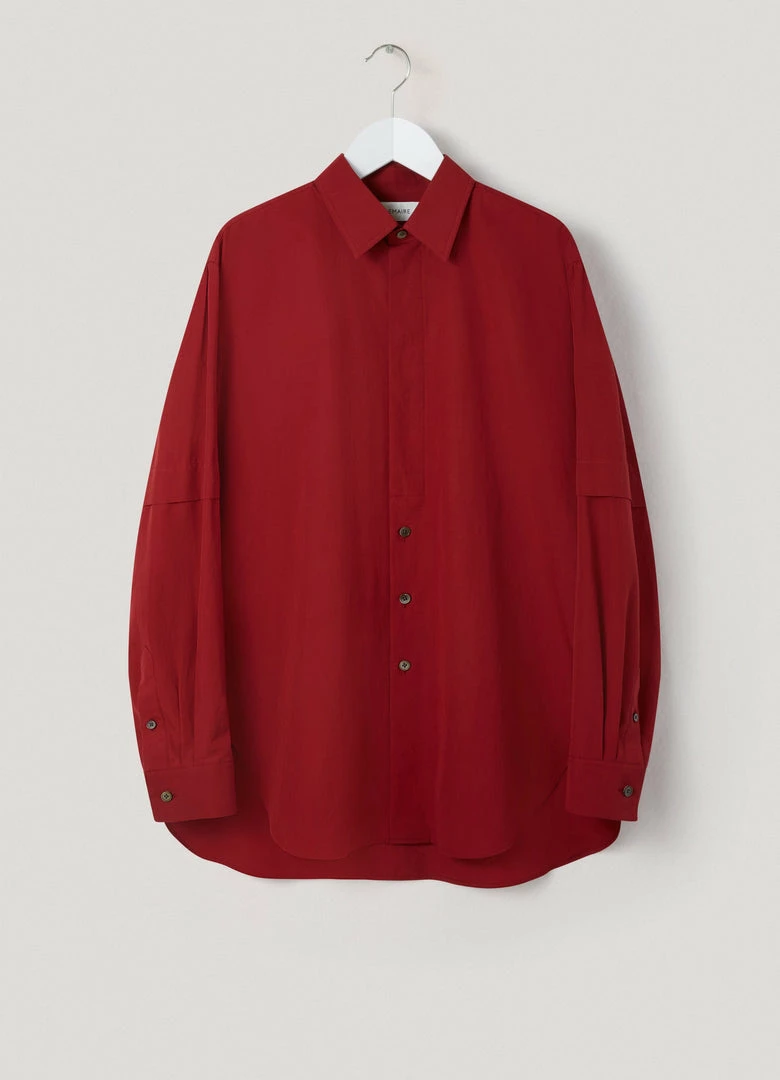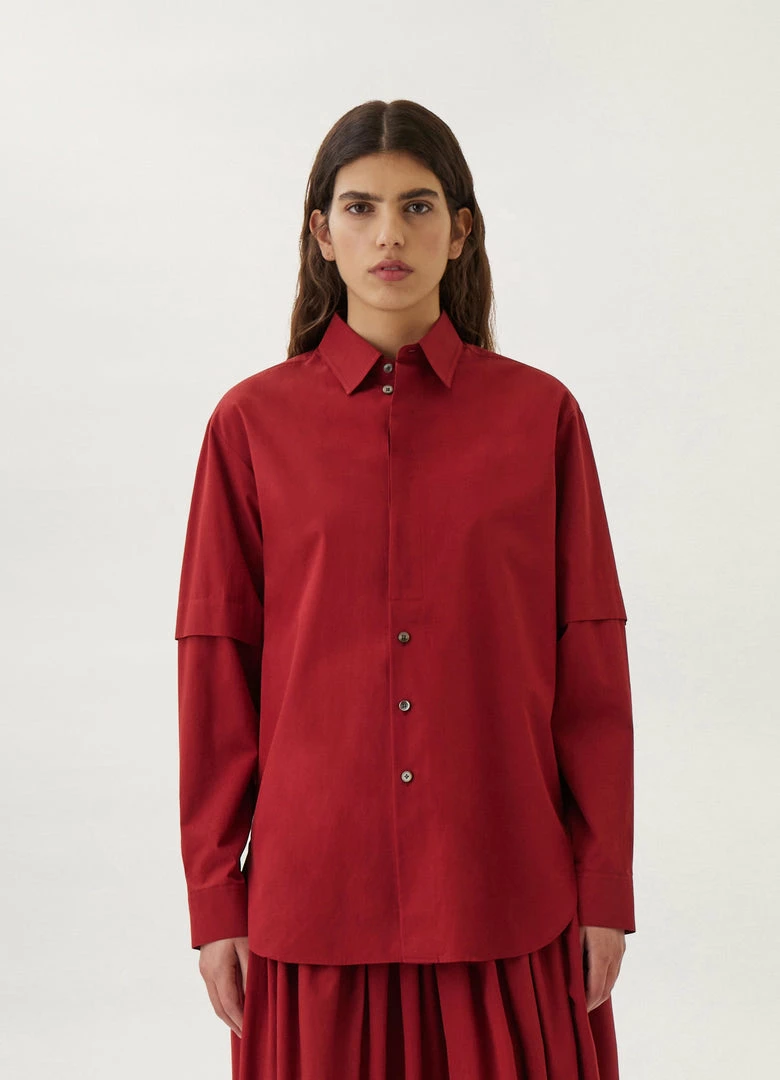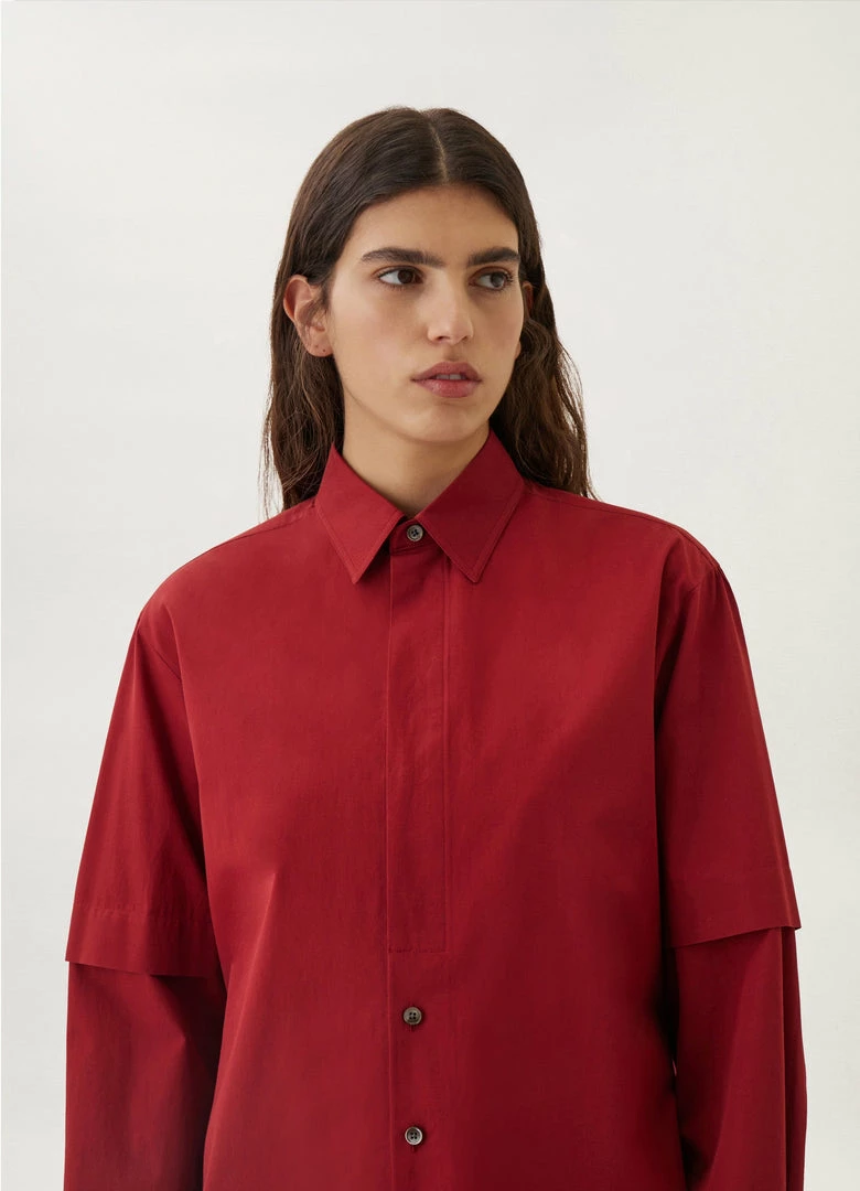 This shirt is made of a heavy poplin for a warmer wear, with a smooth surface woven from organic cotton yarn. It has a trompe-l’oeil construction evoking a short-sleeved shirt layered over a long-sleeved one. It features a classic shirt collar that extends into a partially concealed placket with three visible buttons. Workwear-inspired details include rounded side slits, a back yoke, and contrast stitching.